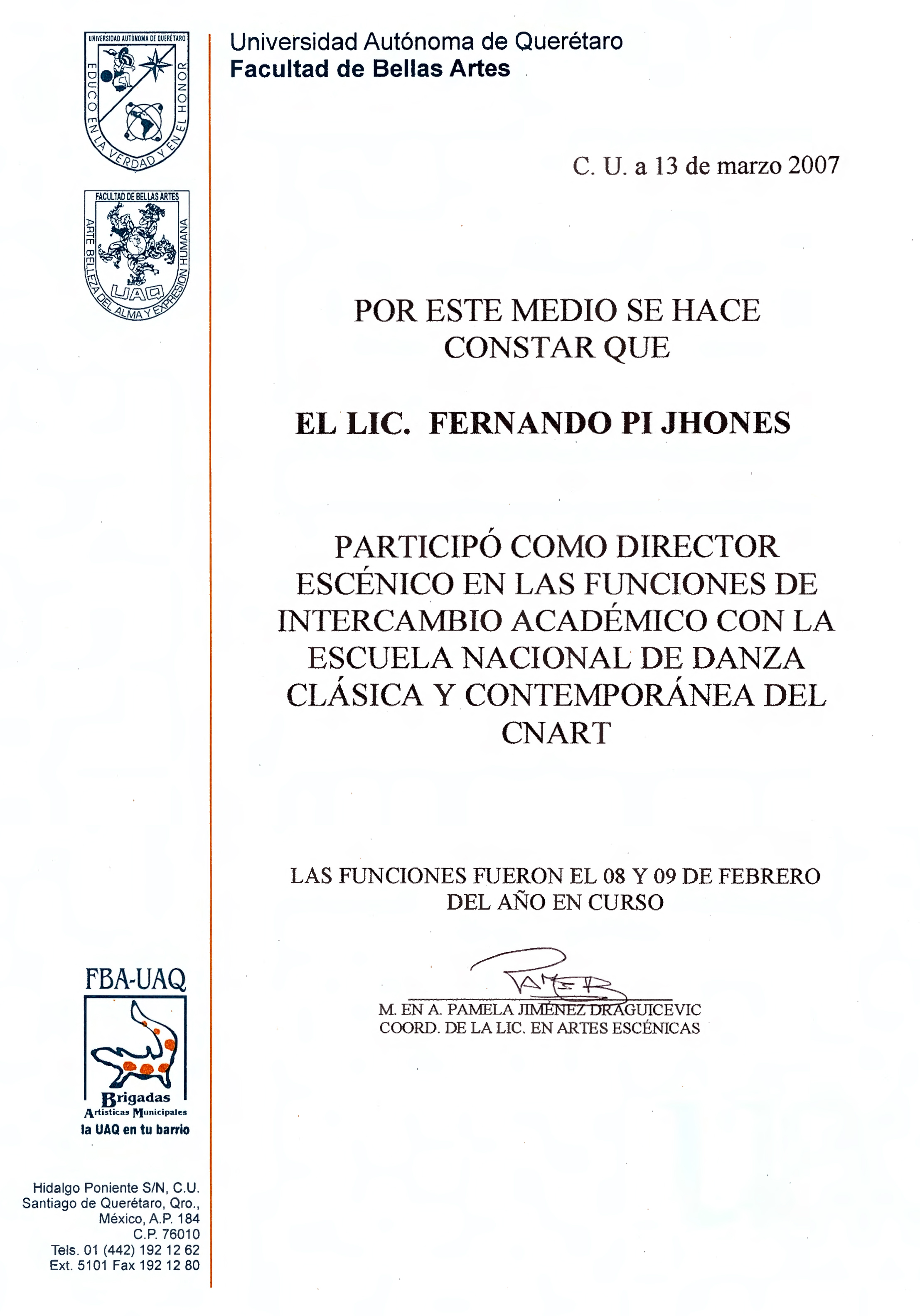 Fernando Jhones, “Constancia Dirección escénica en funciones de Intercambio,” ReDCA-Ballet, consulta 9 de marzo de 2026, http://redca.uaq.mx/ballet/items/show/791.