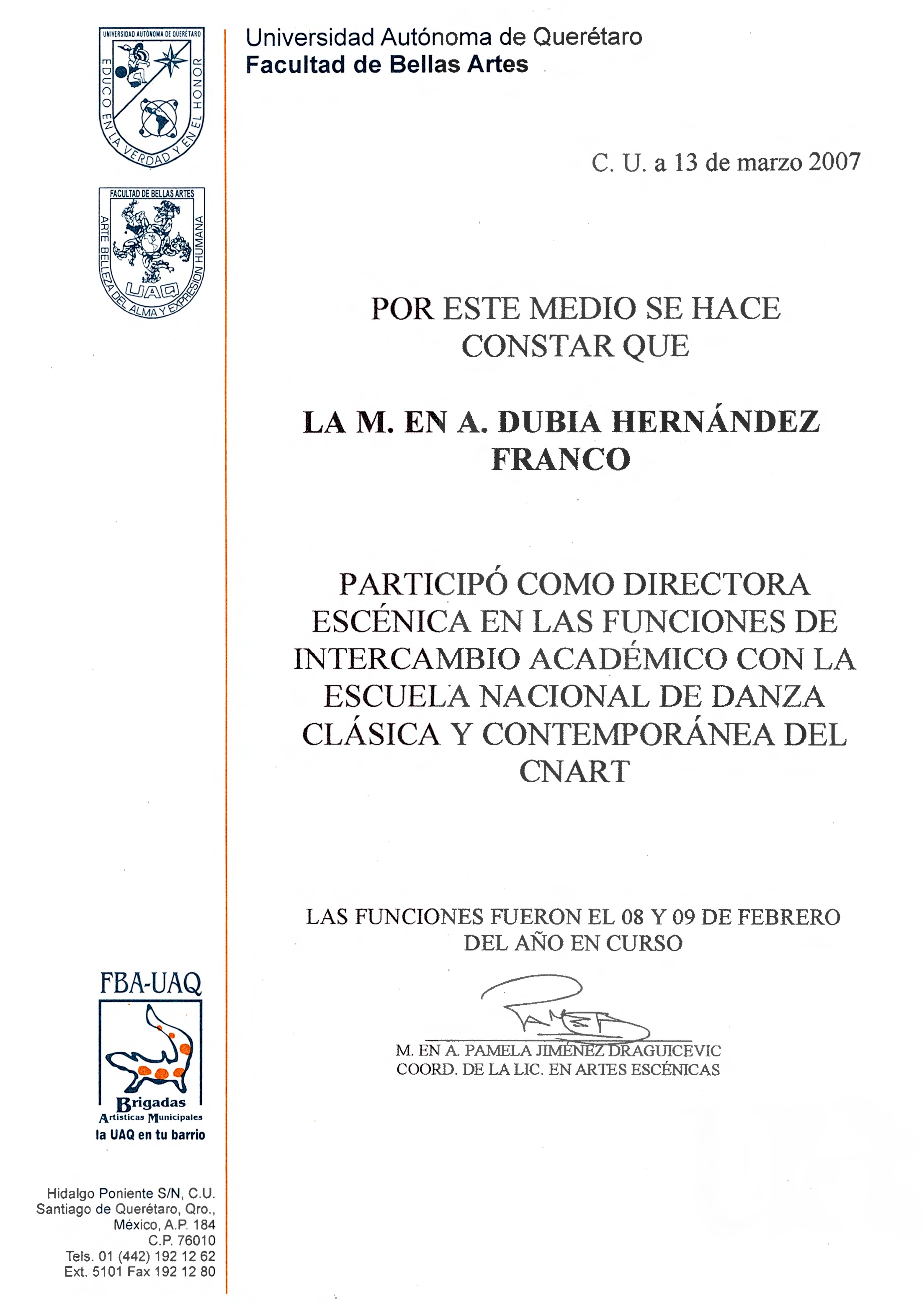 Dubia Hernández, “Constancia Dirección escénica en funciones de Intercambio,” ReDCA-Ballet, consulta 9 de marzo de 2026, http://redca.uaq.mx/ballet/items/show/792.