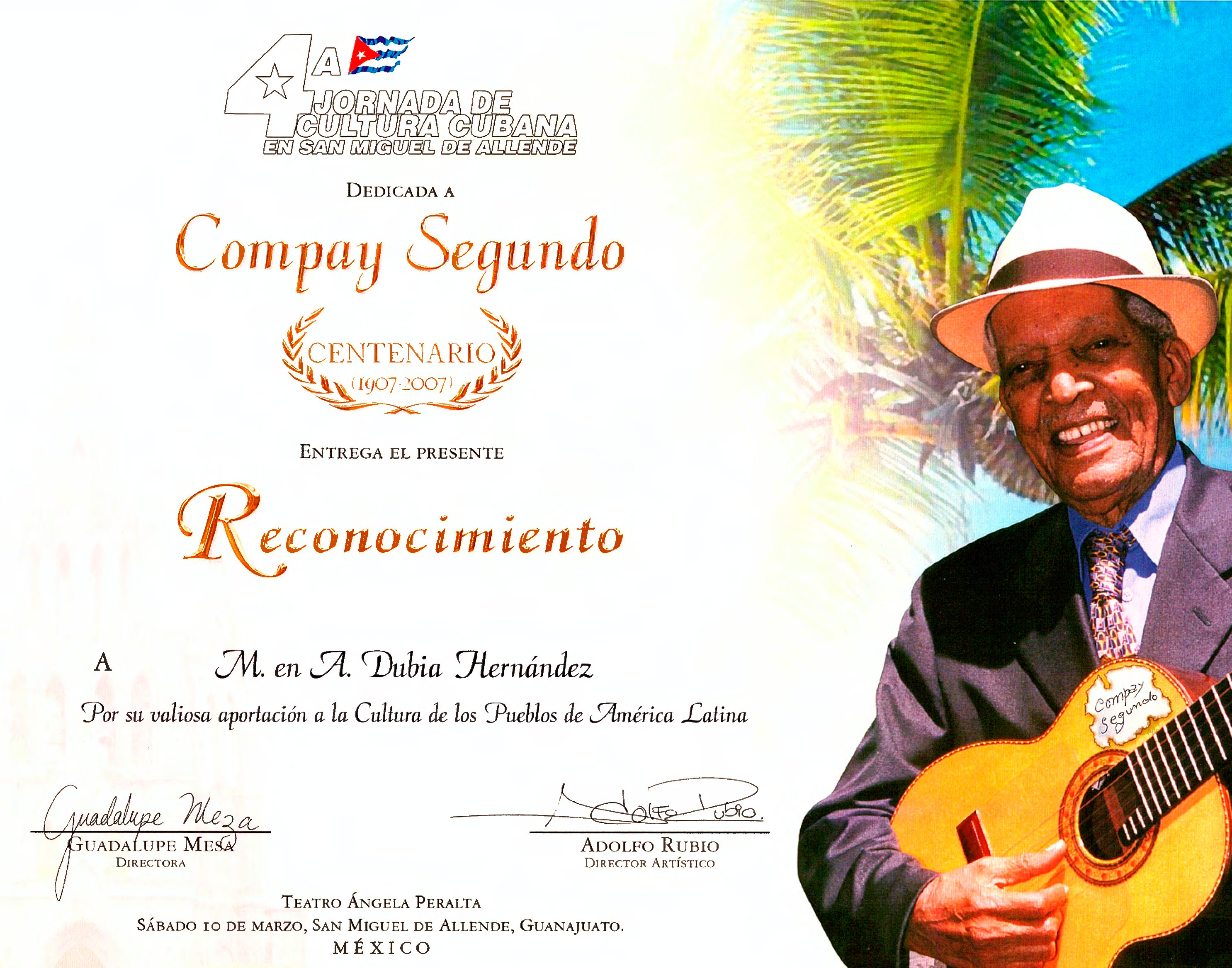 Reconocimiento por participación a la Cultura de los Pueblos de América Latina en el Teatro Ángela Peralta