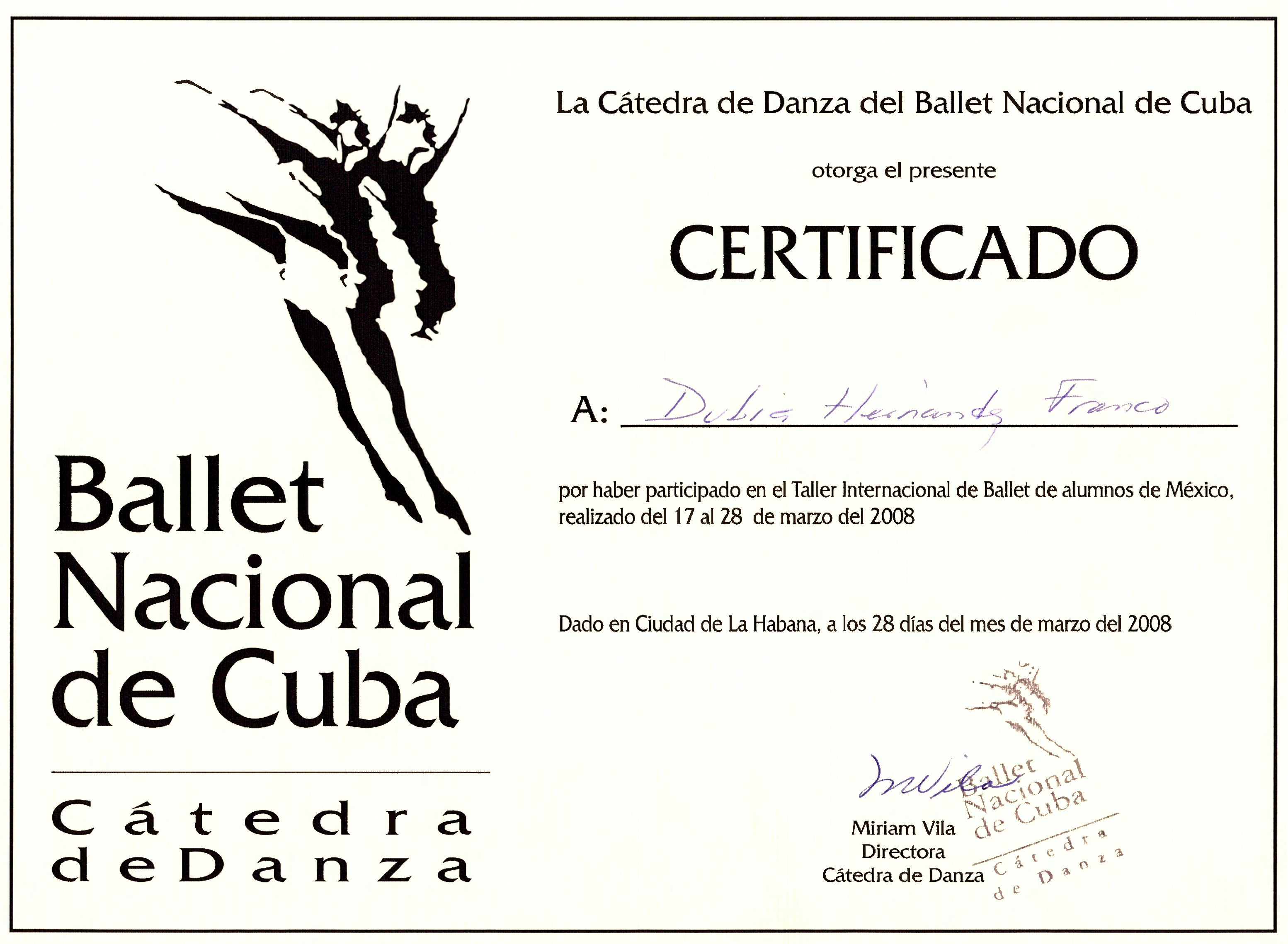 Dubia Hernández, “Certificado Taller Internacional de Ballet 2008,” ReDCA-Ballet, consulta 9 de marzo de 2026, http://redca.uaq.mx/ballet/items/show/804.