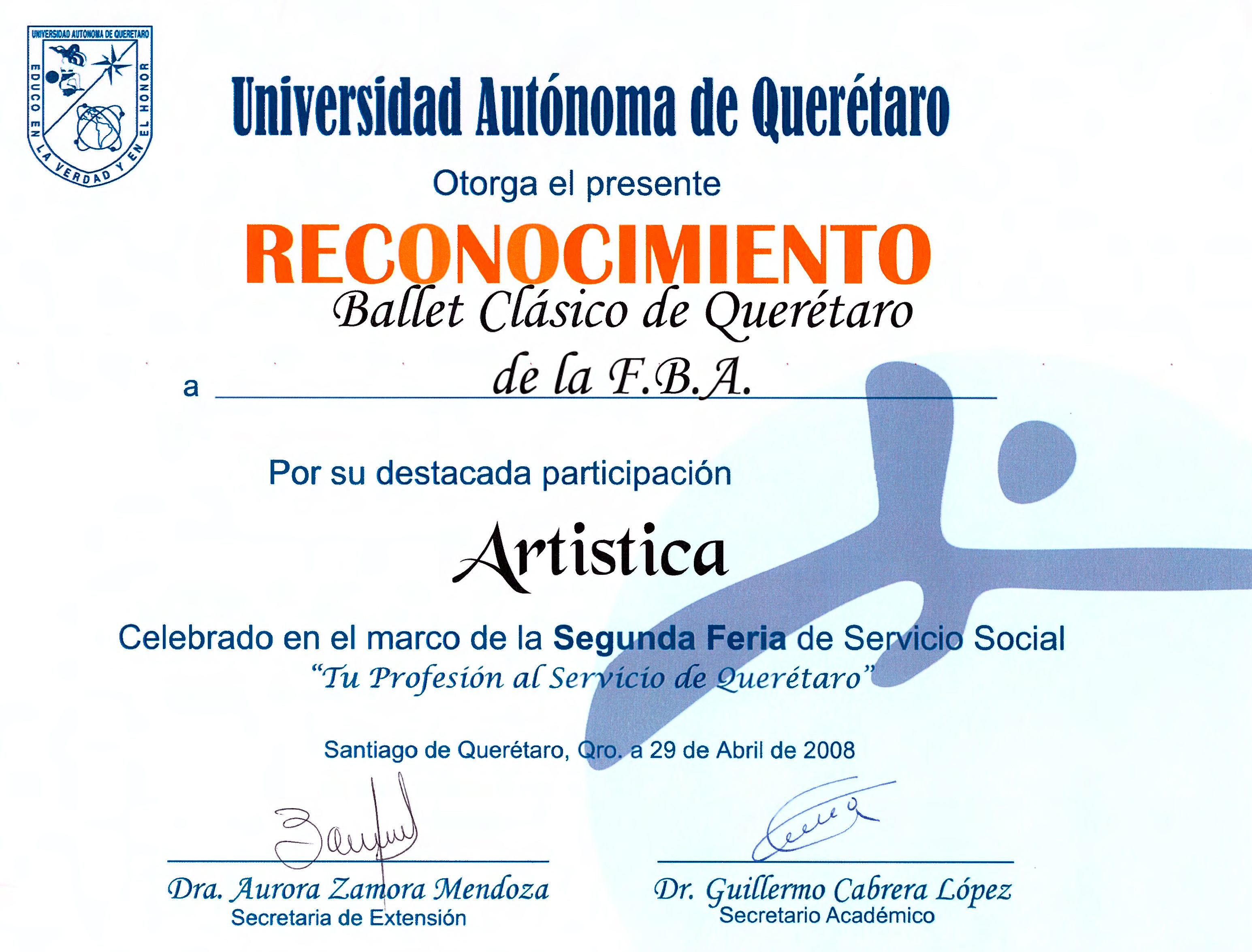 Ballet Clásico de Querétaro, “Reconocimiento 2da Feria Servicio Social 2008,” ReDCA-Ballet, consulta 9 de marzo de 2026, http://redca.uaq.mx/ballet/items/show/806.