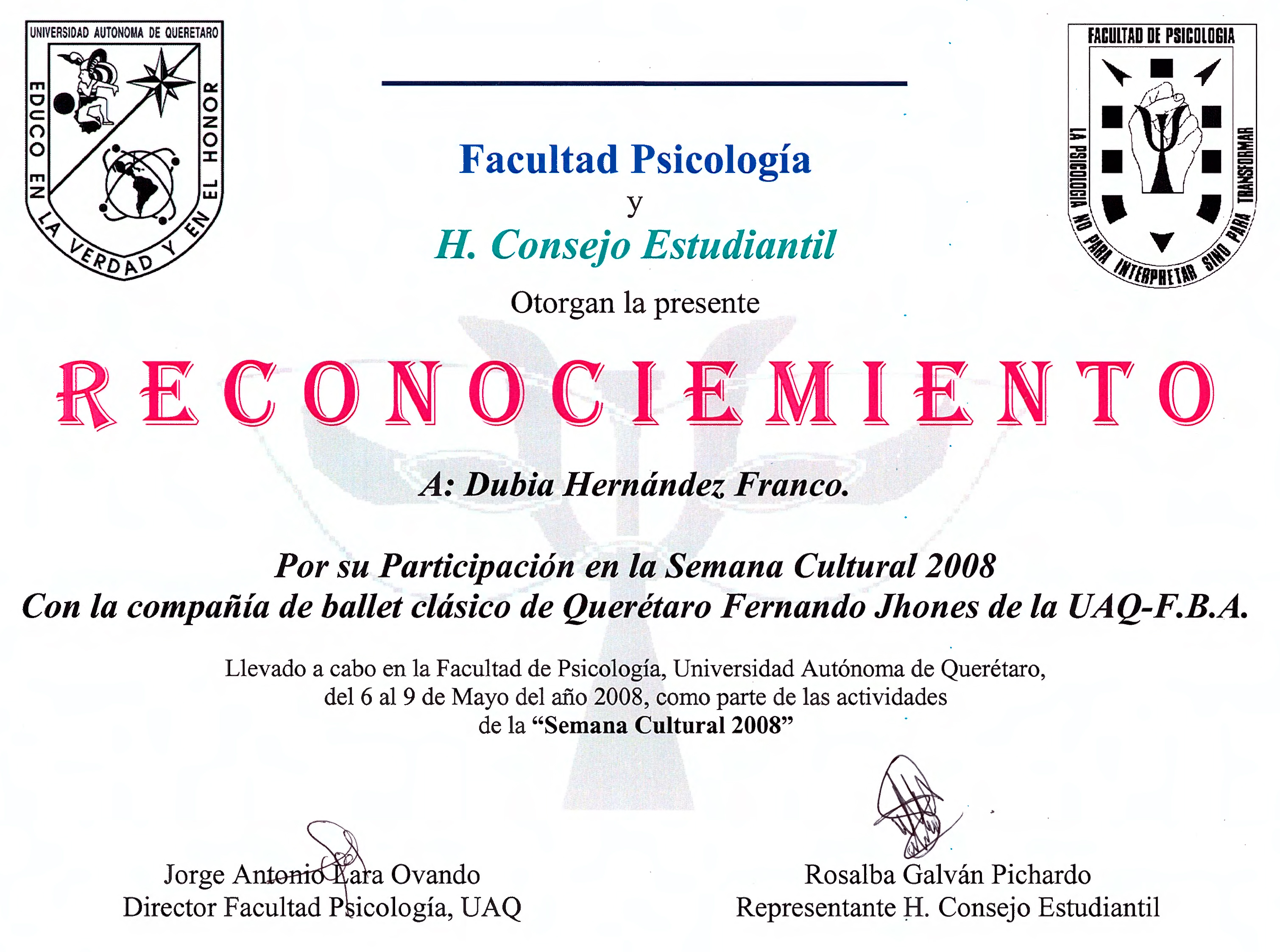 Reconocimiento por participación en la Semana Cultural 2008 con el Ballet Clásico en la Facultad de Psicología