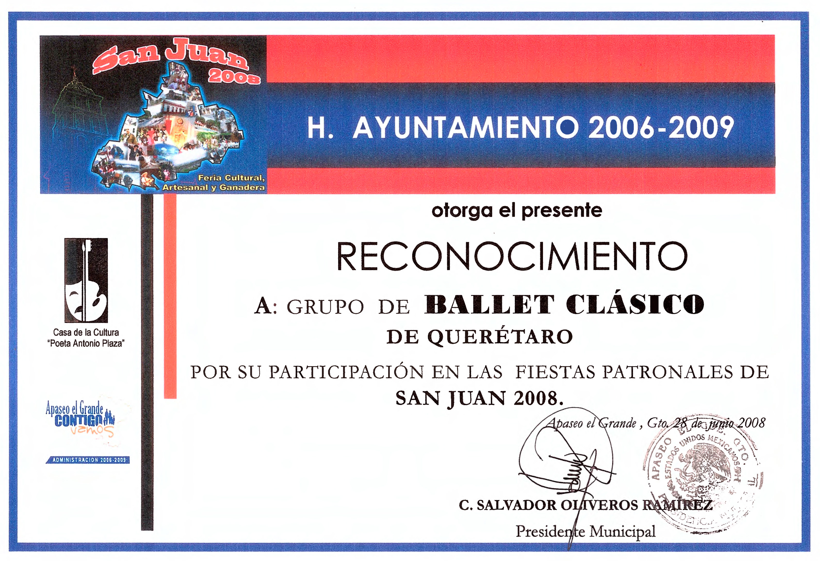 Ballet Clásico de Querétaro, “Reconocimiento Fiestas Patronales de San Juan 2008,” ReDCA-Ballet, consulta 9 de marzo de 2026, http://redca.uaq.mx/ballet/items/show/809.