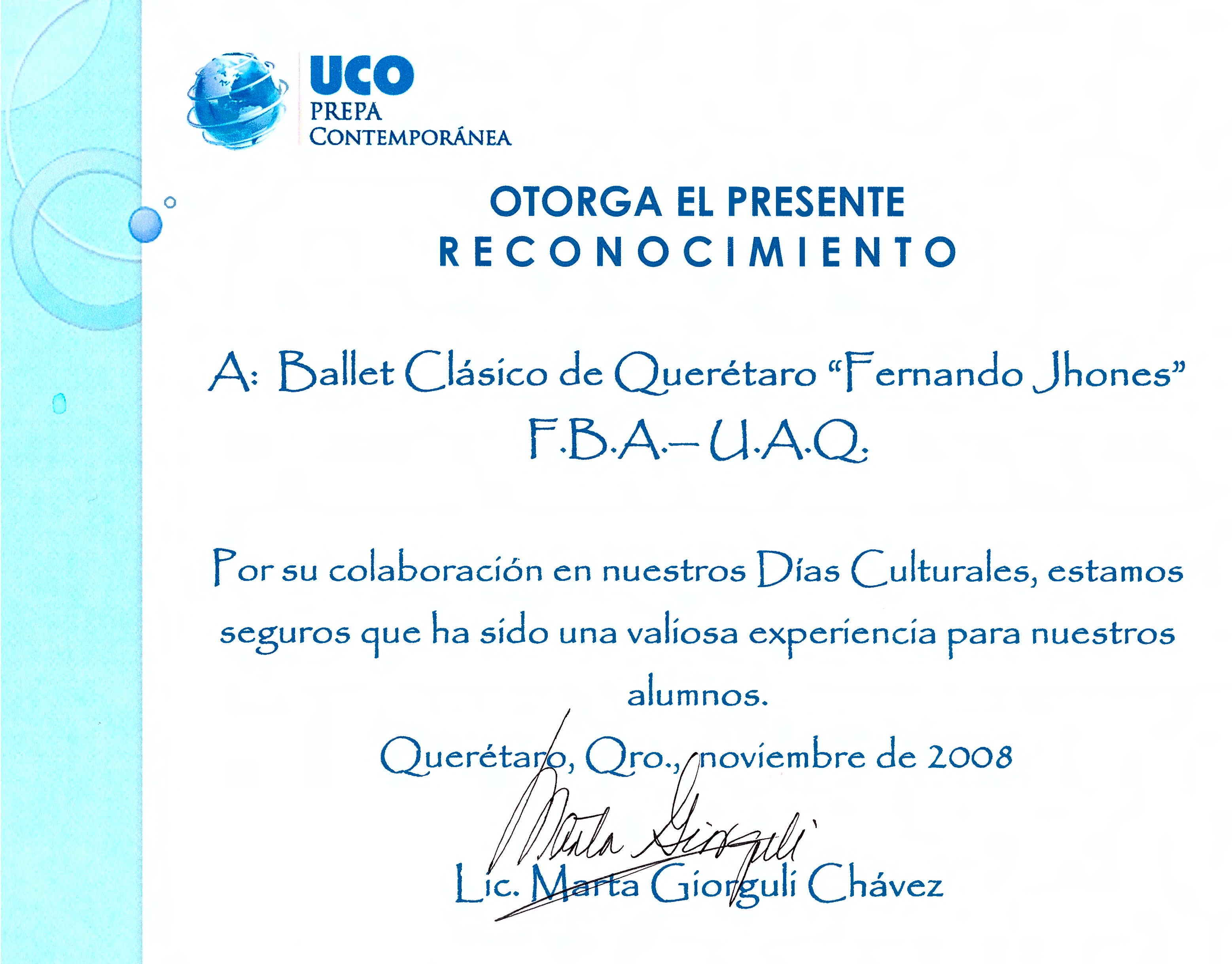 Ballet Clásico de Querétaro, “Reconocimiento Días Culturales 2008,” ReDCA-Ballet, consulta 9 de marzo de 2026, http://redca.uaq.mx/ballet/items/show/812.
