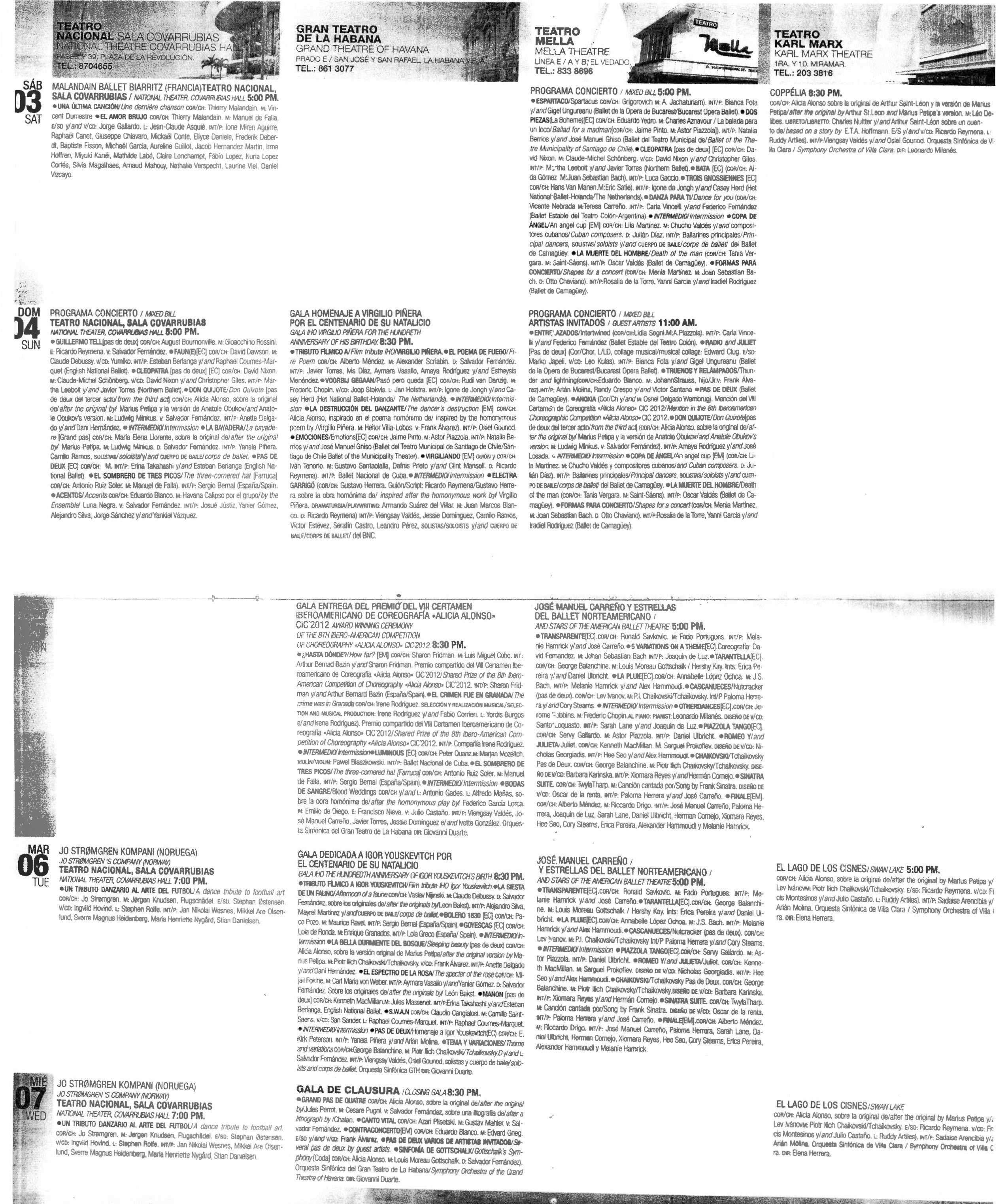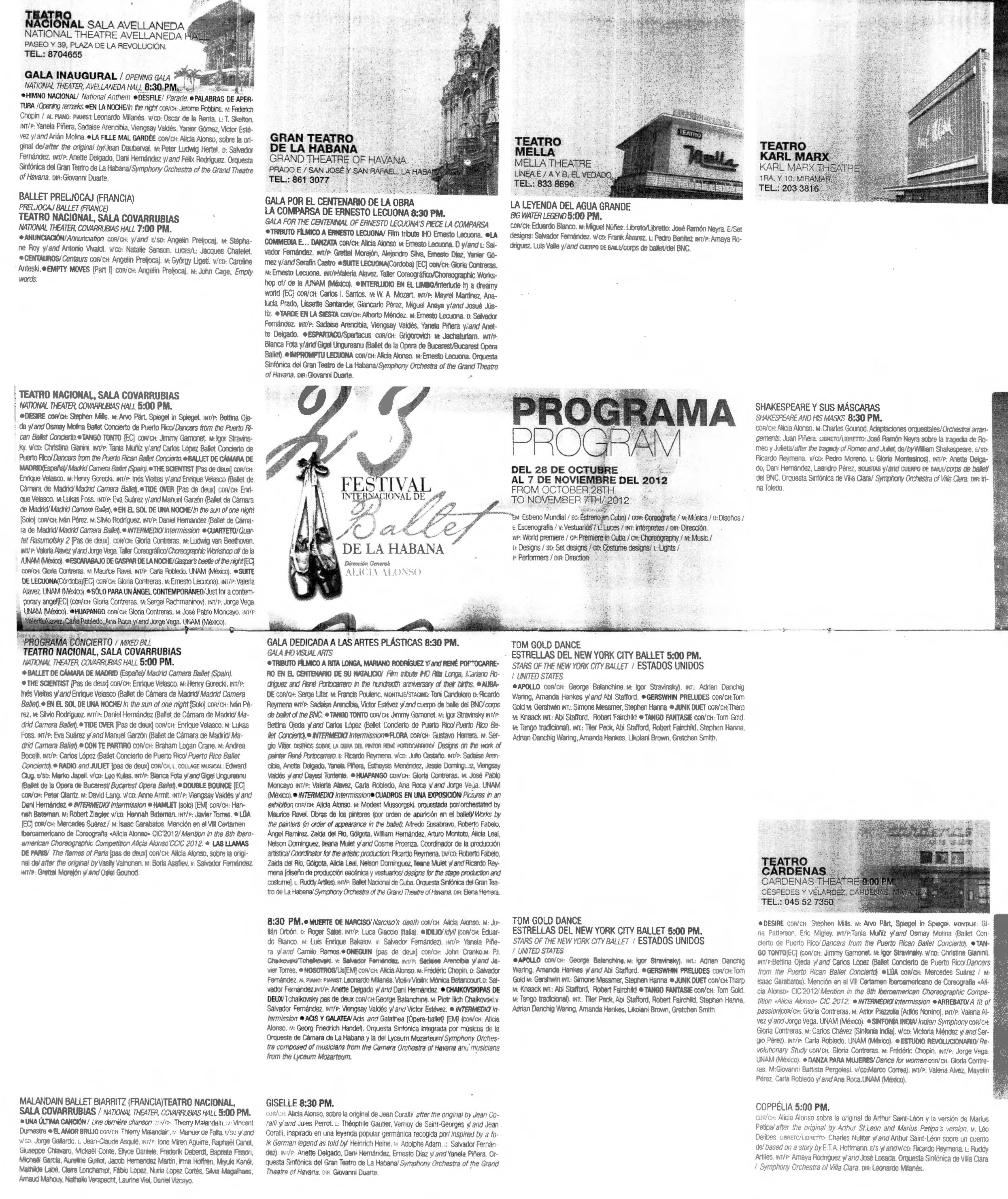Programa de las presentaciones por el 23 Festival Internacional de Ballet de La Habana en diversos teatros dentro de La Habana con la dirección gral de Alicia Alonso
