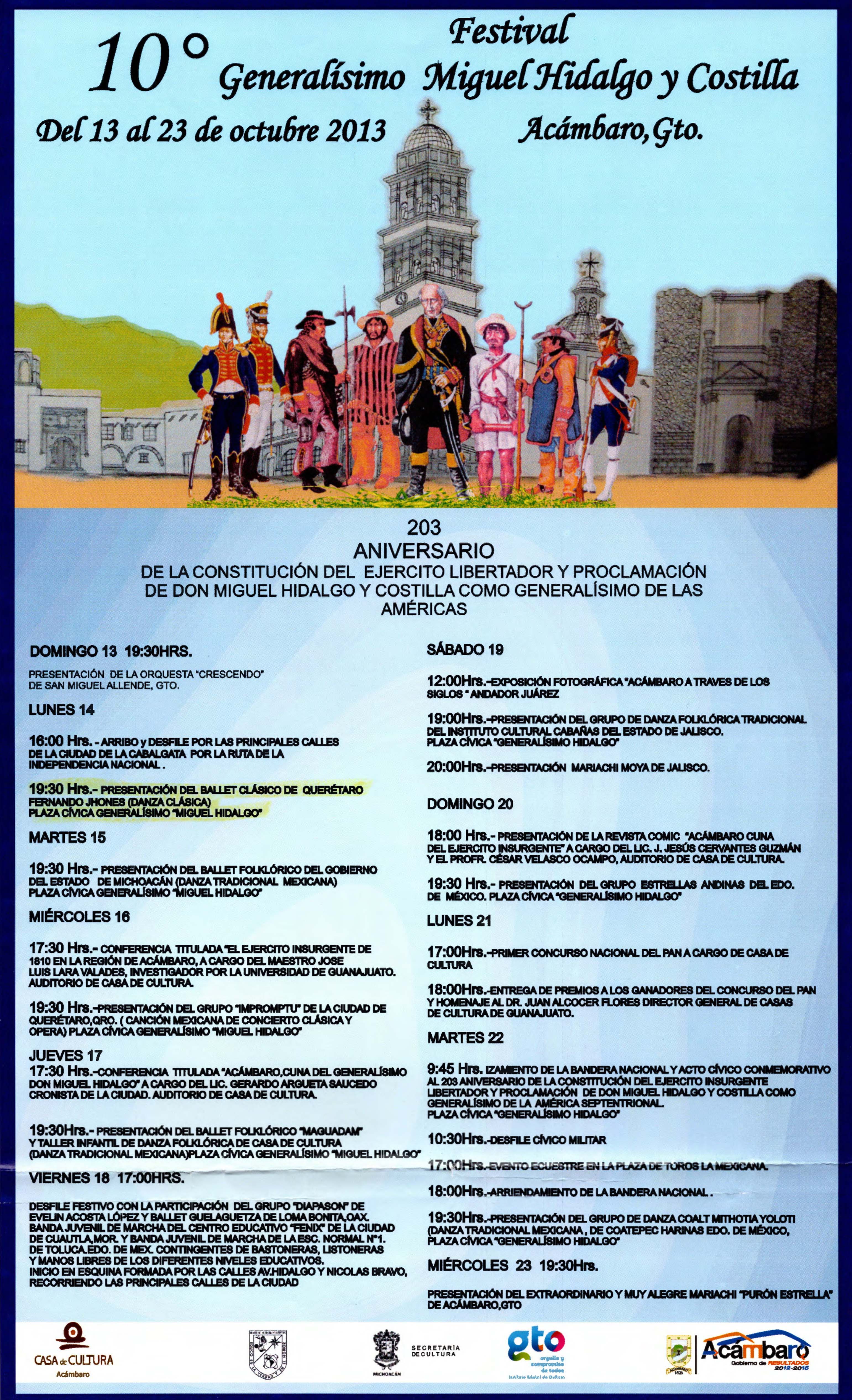 Programa de actividades para el 10mo Festival Generalisímo Miguel Hidalgo y Costilla.