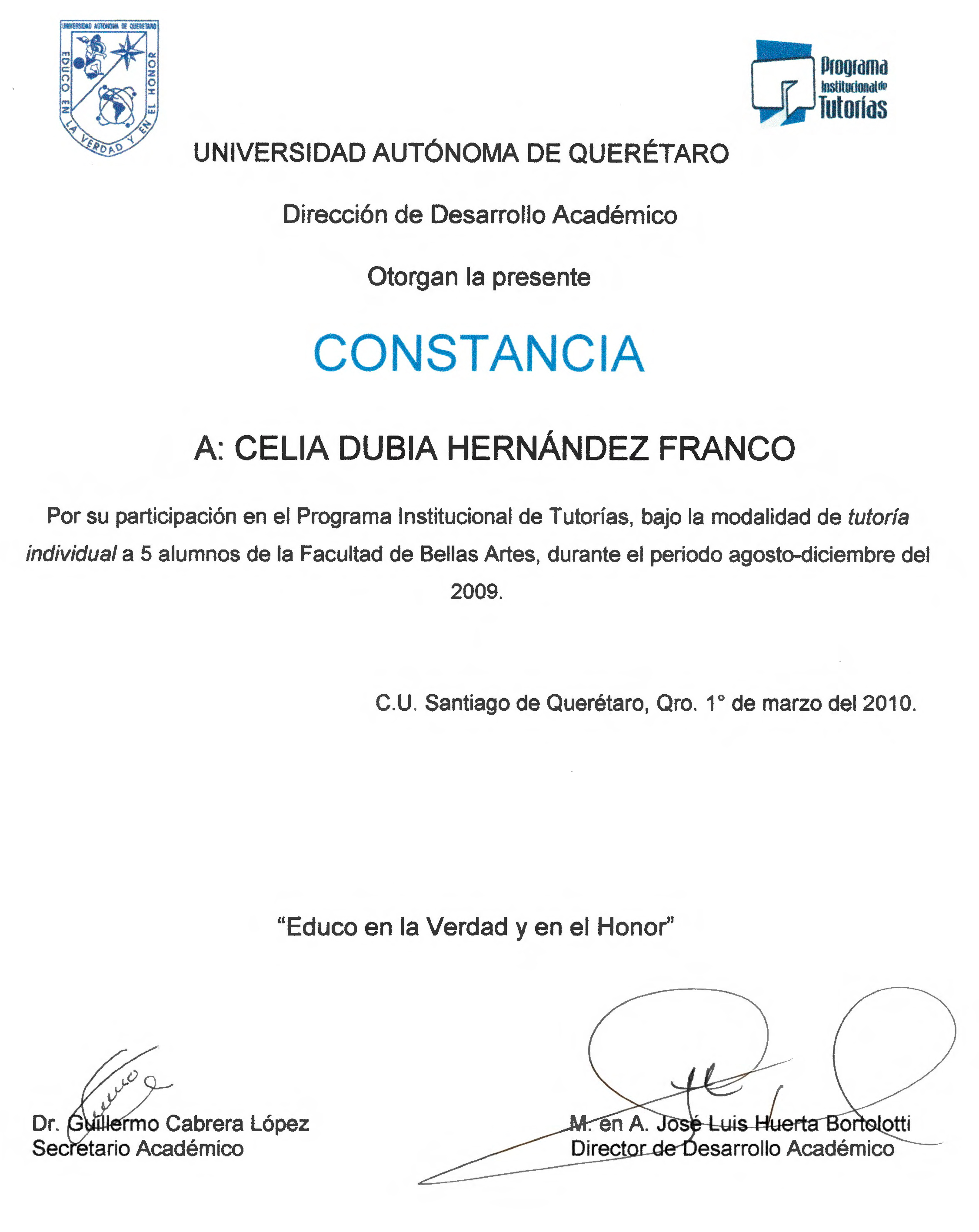 Dubia Hernández, “Constancia Programa Institucional de Tutorías 2009 ago-dic,” ReDCA-Ballet, consulta 9 de marzo de 2026, http://redca.uaq.mx/ballet/items/show/825.