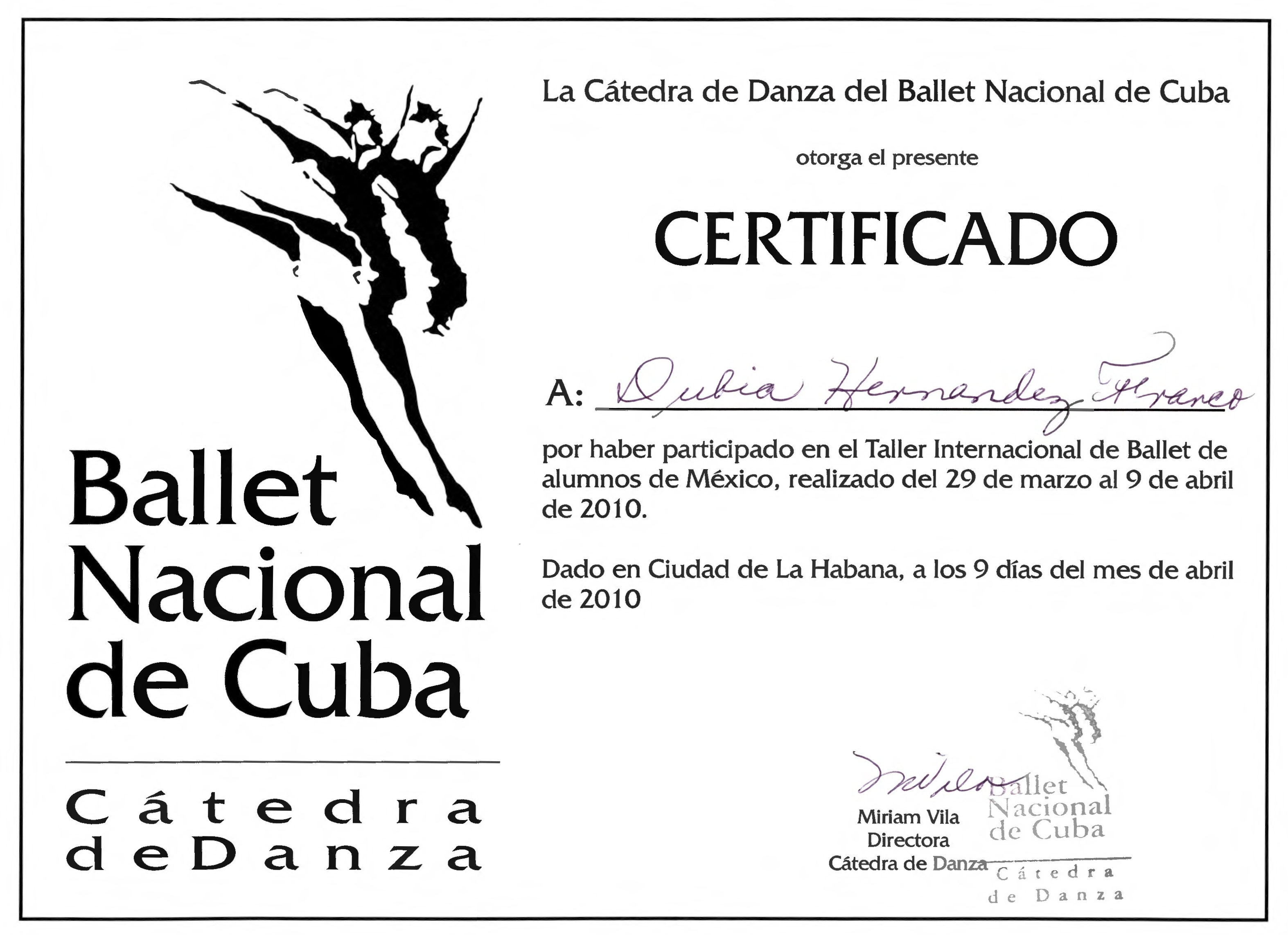 Certificado por haber participado en el Taller Internacional de Ballet de alumnos de México de la Cátedra de Danza del Ballet Nacional de Cuba