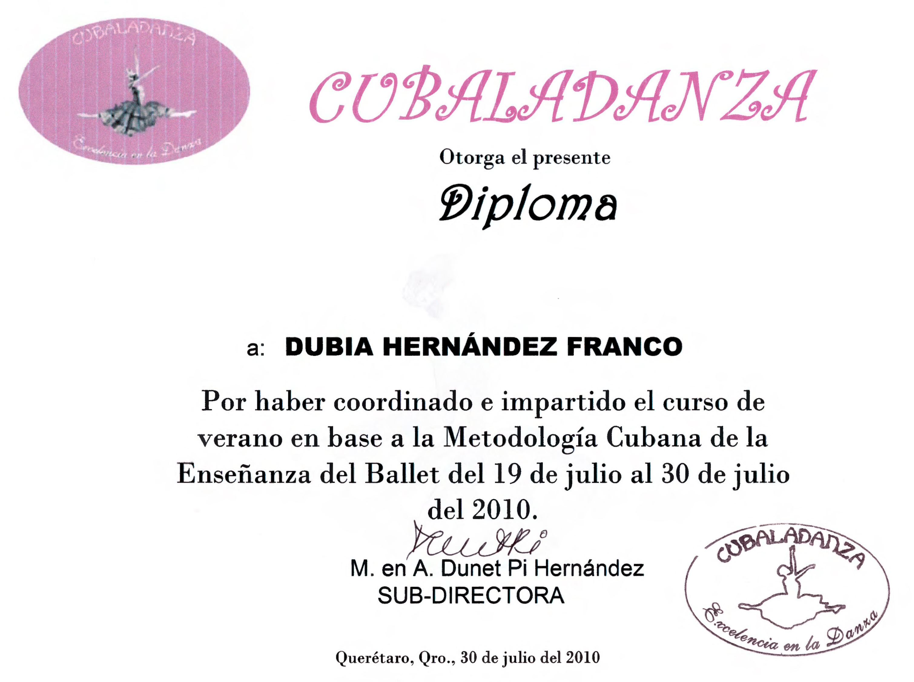 Dubia Hernández, “Diploma a la Metodología Cubana de la Enseñanza del Ballet 2010,” ReDCA-Ballet, consulta 9 de marzo de 2026, http://redca.uaq.mx/ballet/items/show/828.