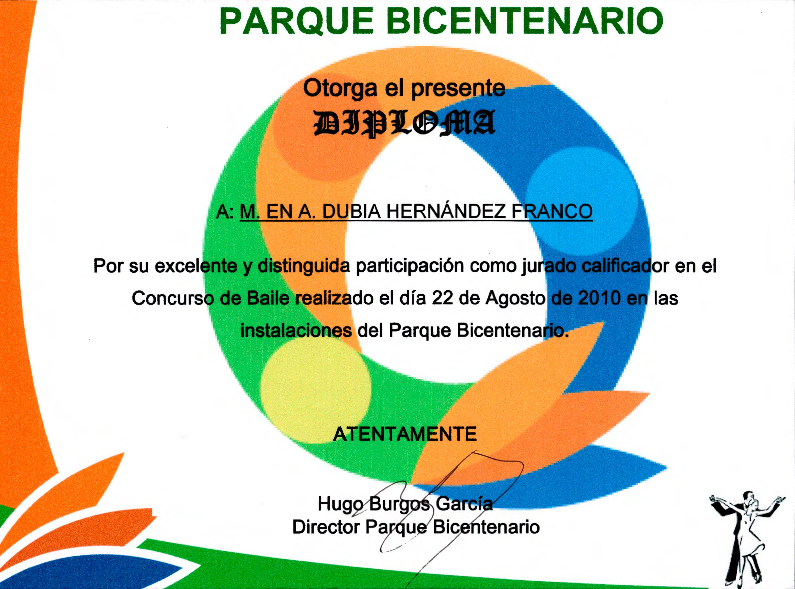 Diploma por participación como jurado calificador en el Concurso de baile del 22 de agosto en Parque Bicentenario