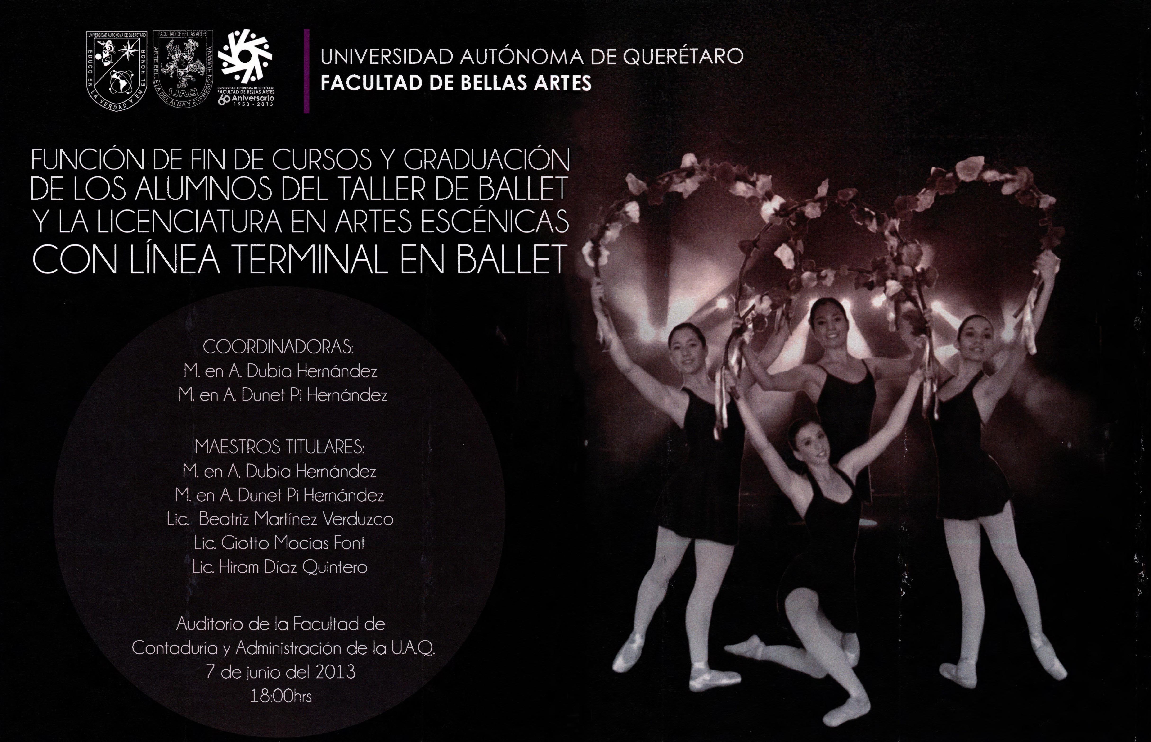 Cartel y programa para la función de fin de cursos y graduación de los alumnos del taller de ballet y la Licenciatura en Artes Escénicas con Línea Terminal en Ballet.