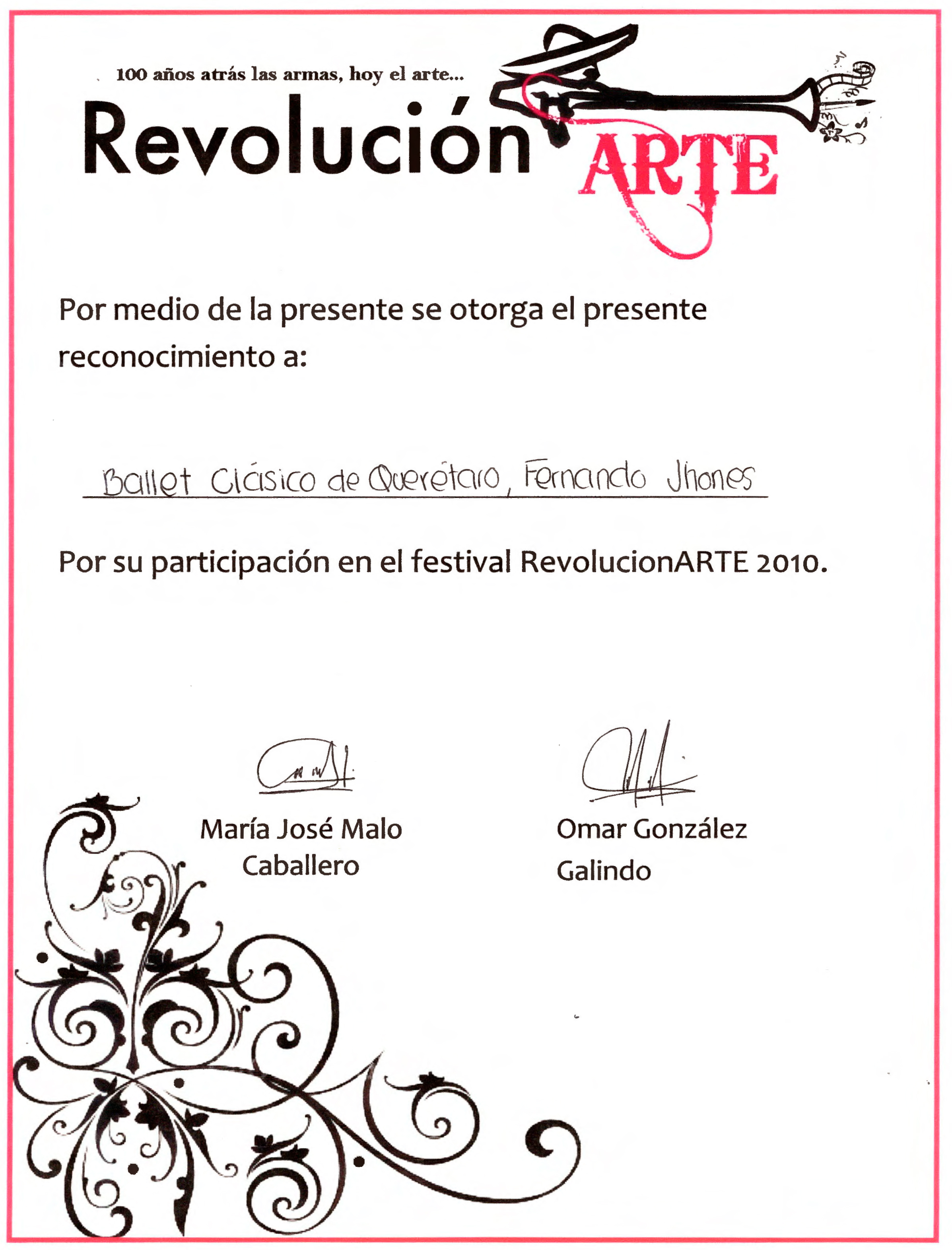 Reconocimiento por participación en el festival RevolucionARTE 2010