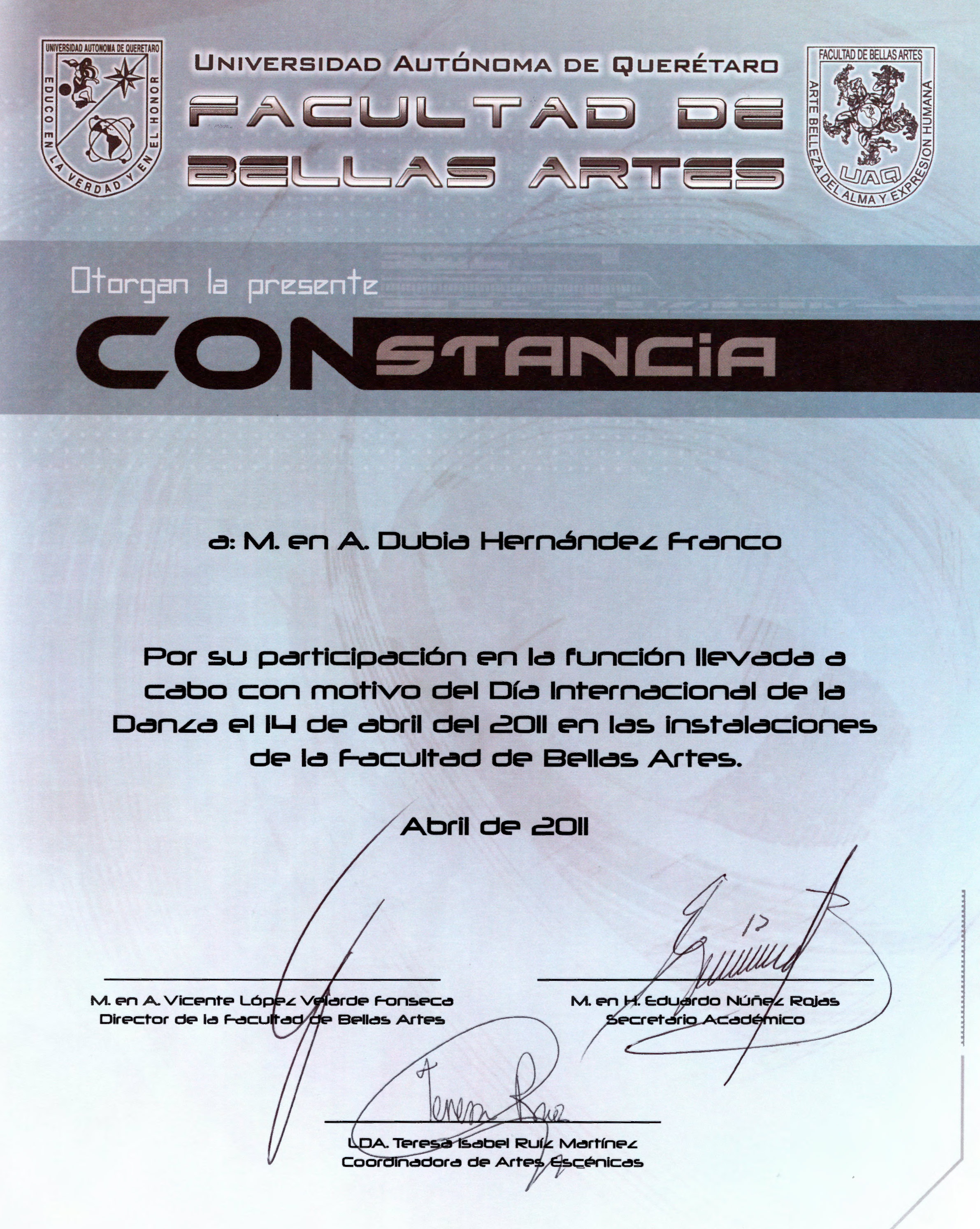 Constancia por participación en el Día Internacional de la Danza en la FBA de la UAQ