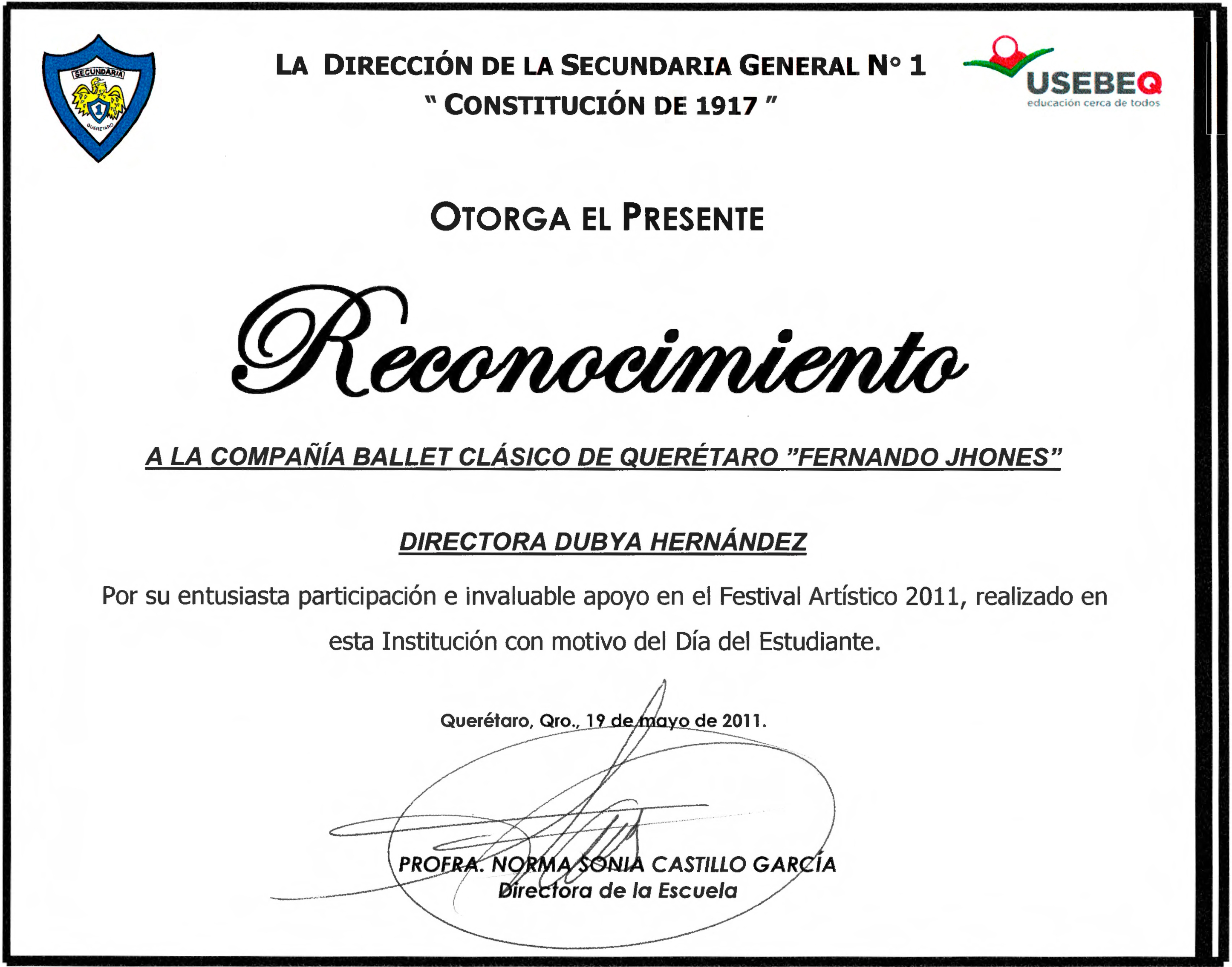 Reconocimiento por participación y apoyo en el Festival Artístico 2011, realizado en la Secundaria Gral. N°1 con motivo del Día del Estudiante