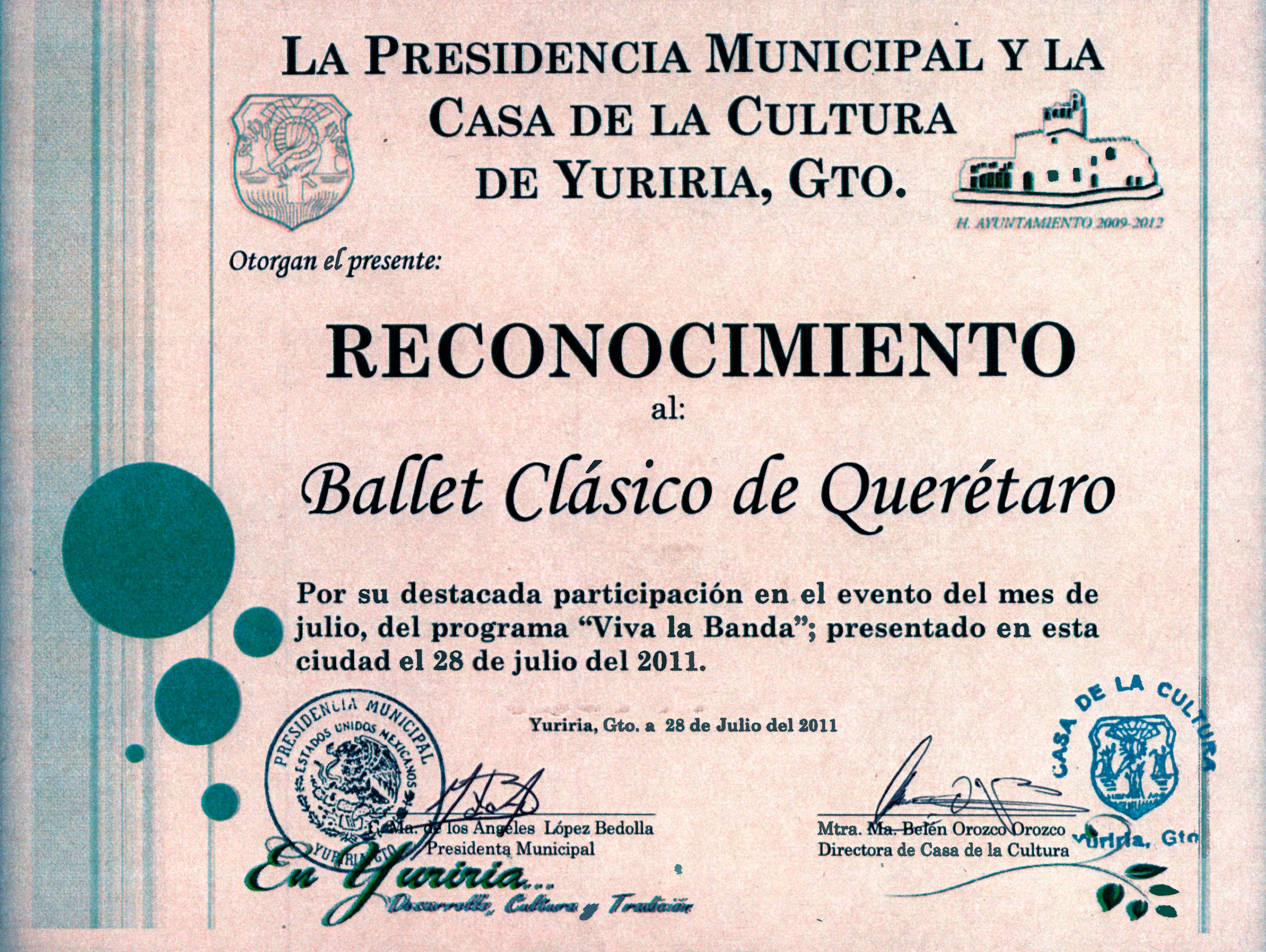 Ballet Clásico de Querétaro, “Reconocimiento Programa Viva la Banda 2011,” ReDCA-Ballet, consulta 9 de marzo de 2026, http://redca.uaq.mx/ballet/items/show/841.