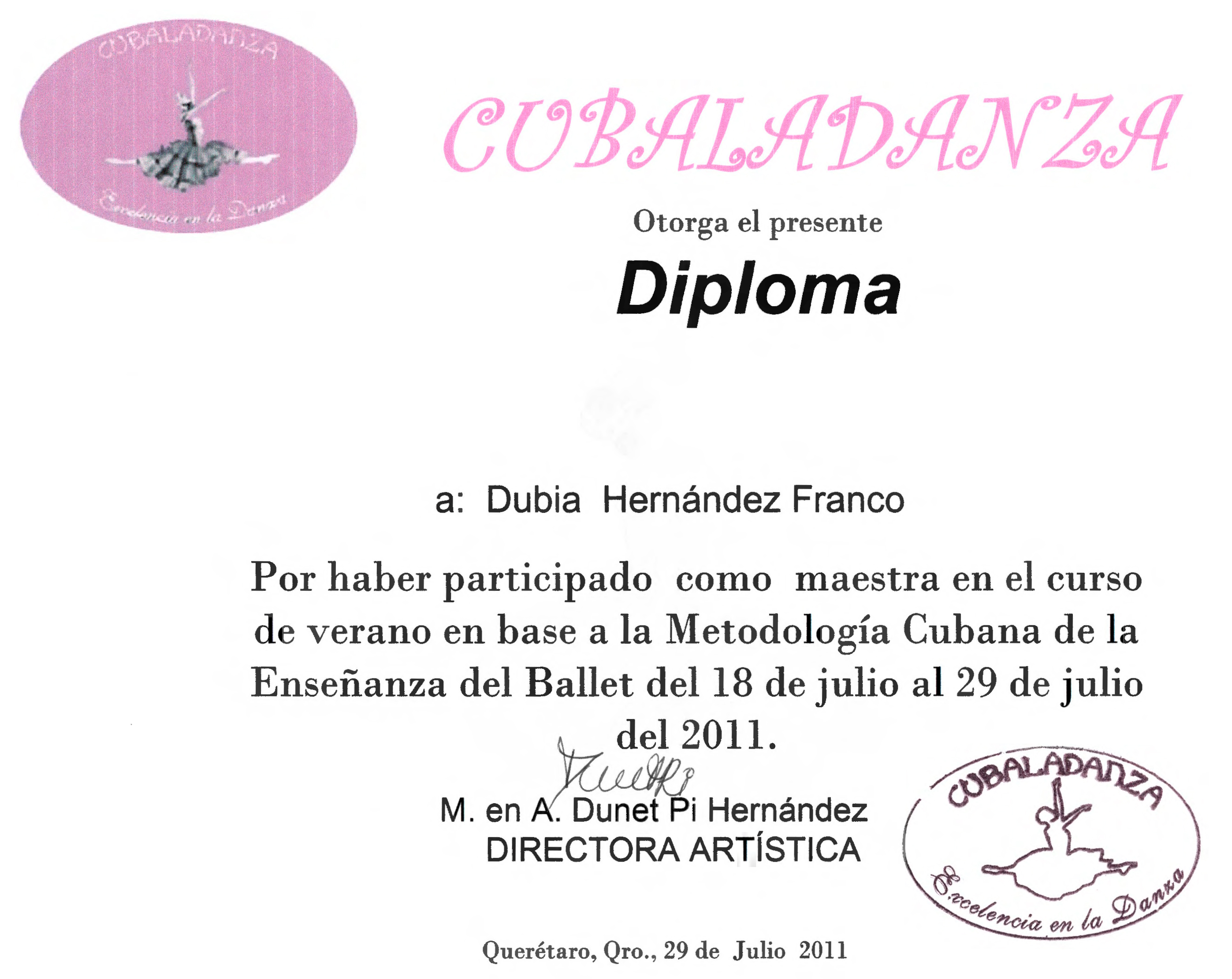 Diploma por haber participado como maestra en el curso de verano en base a la Metodología Cubana de la Enseñanza del Ballet en Cubaladanza