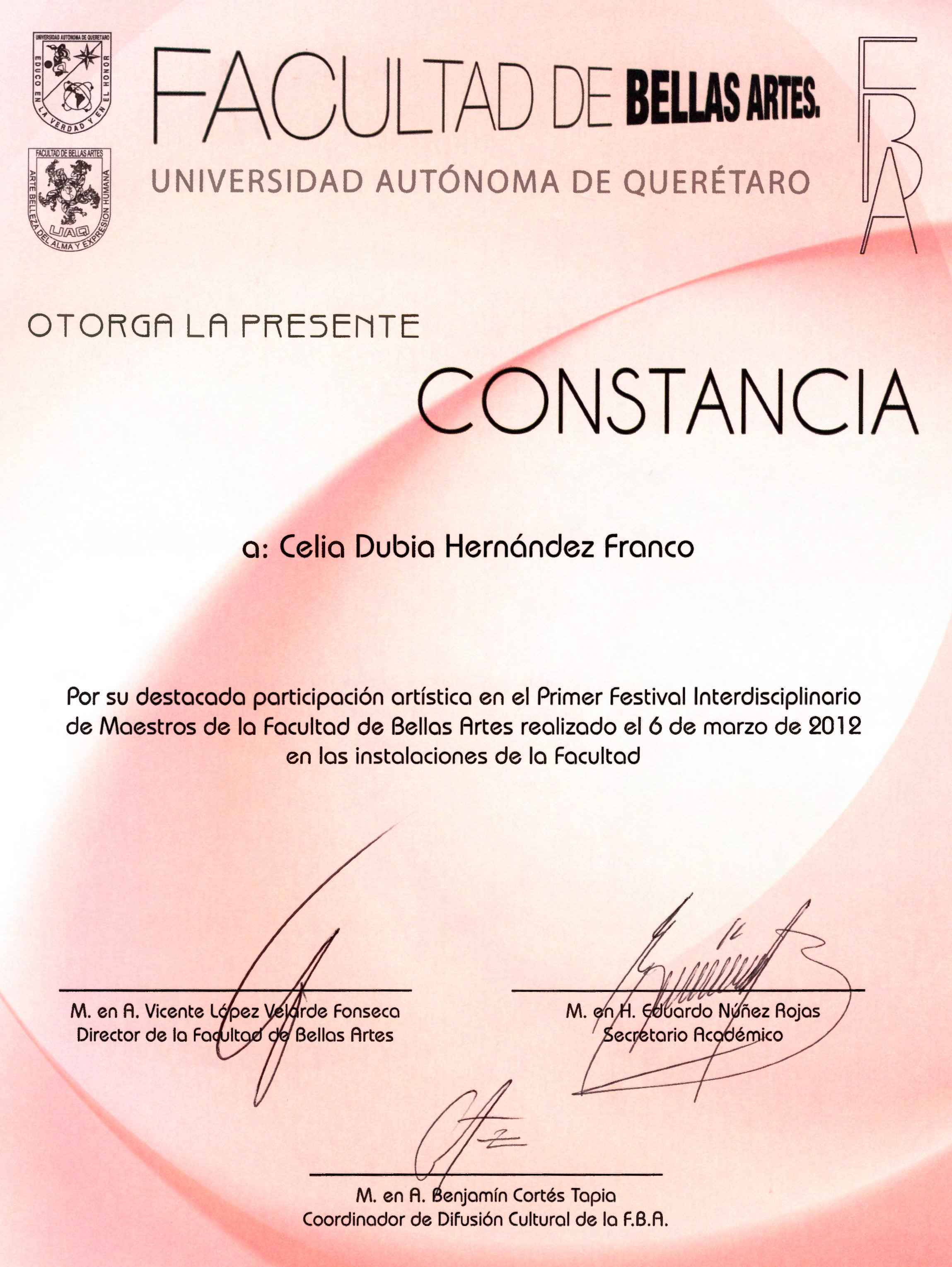 Constancia por participación artística en el Primer Festival Interdisciplinario de Maestros de la FBA en las instalaciones de la misma de la UAQ
