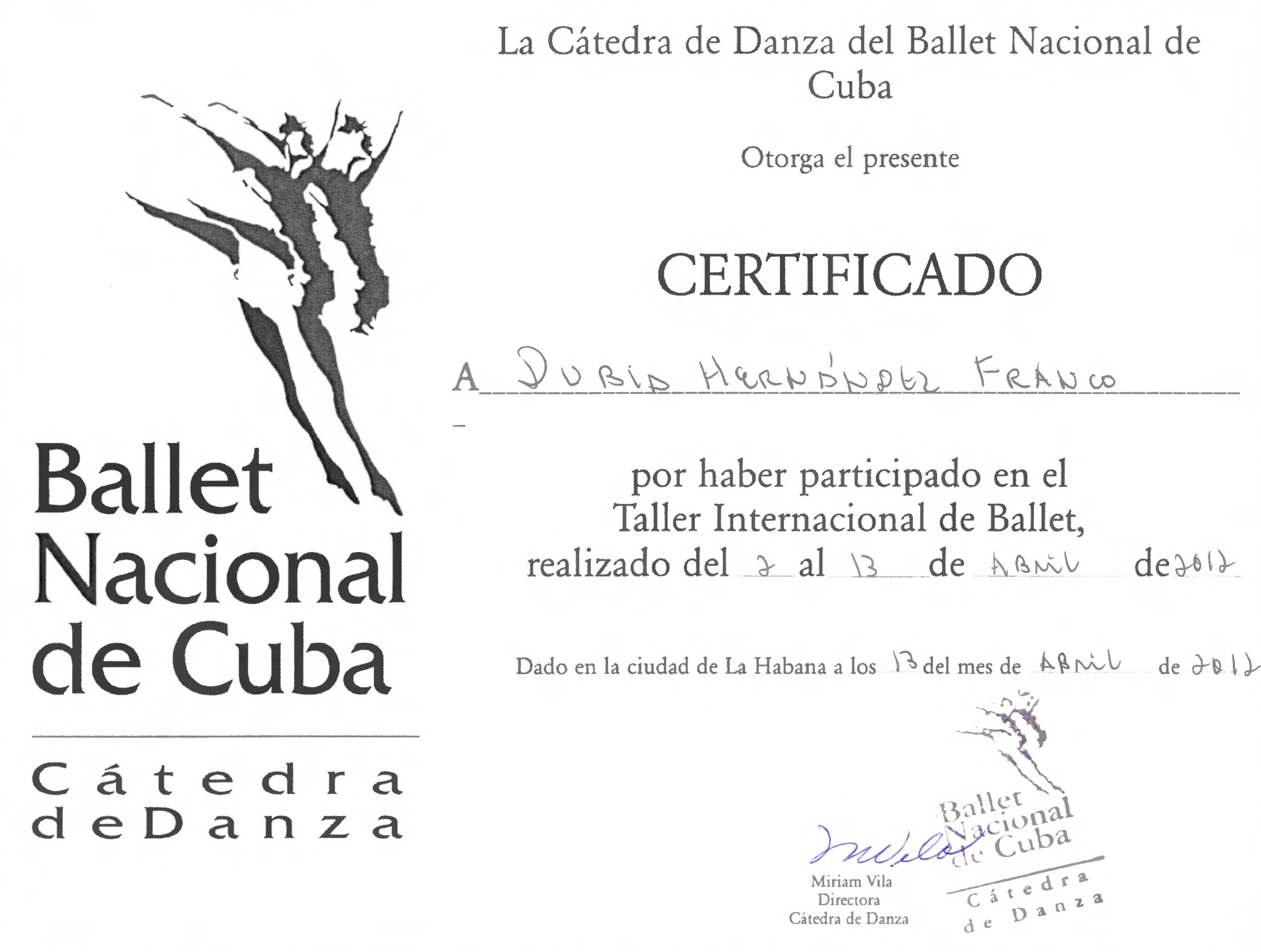 Certificado por participar en el Taller Internacional de Ballet por la Cátedra de Danza del Ballet Nacional de Cuba