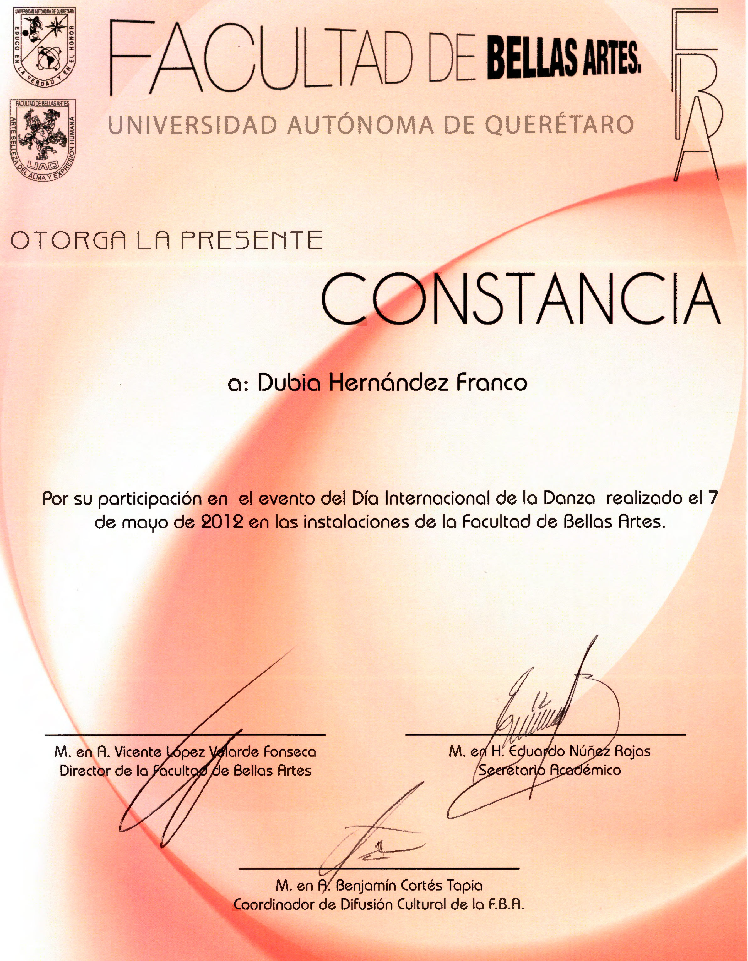 Dubia Hernández, “Constancia Día Internacional de la Danza 2012,” ReDCA-Ballet, consulta 9 de marzo de 2026, http://redca.uaq.mx/ballet/items/show/851.