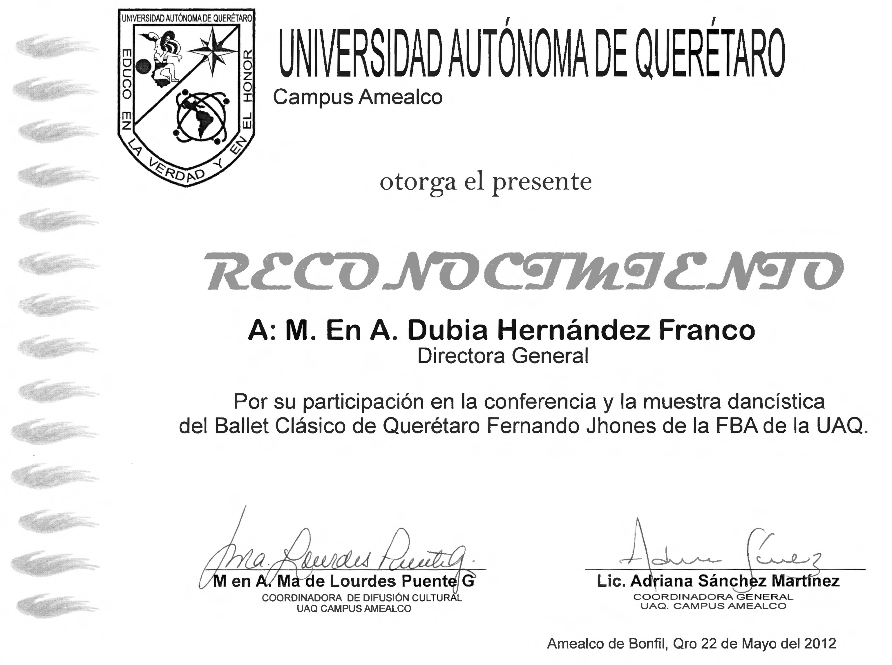 Dubia Hernández, “Reconocimiento Conferencia y muestra dancística Amealco 2012,” ReDCA-Ballet, consulta 9 de marzo de 2026, http://redca.uaq.mx/ballet/items/show/852.