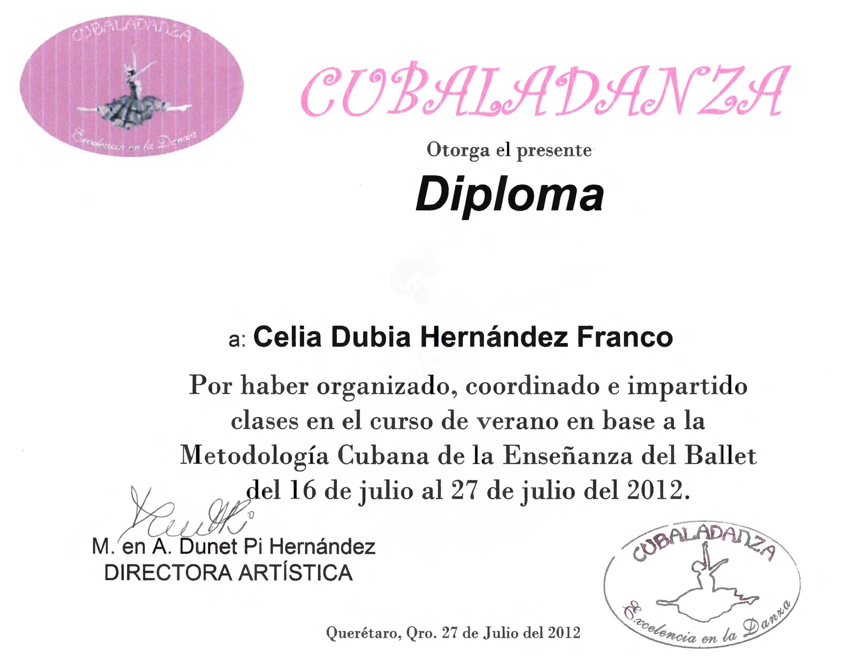 Dubia Hernández, “Diploma Metodología Cubana de la Enseñanza del Ballet 2012,” ReDCA-Ballet, consulta 9 de marzo de 2026, http://redca.uaq.mx/ballet/items/show/854.
