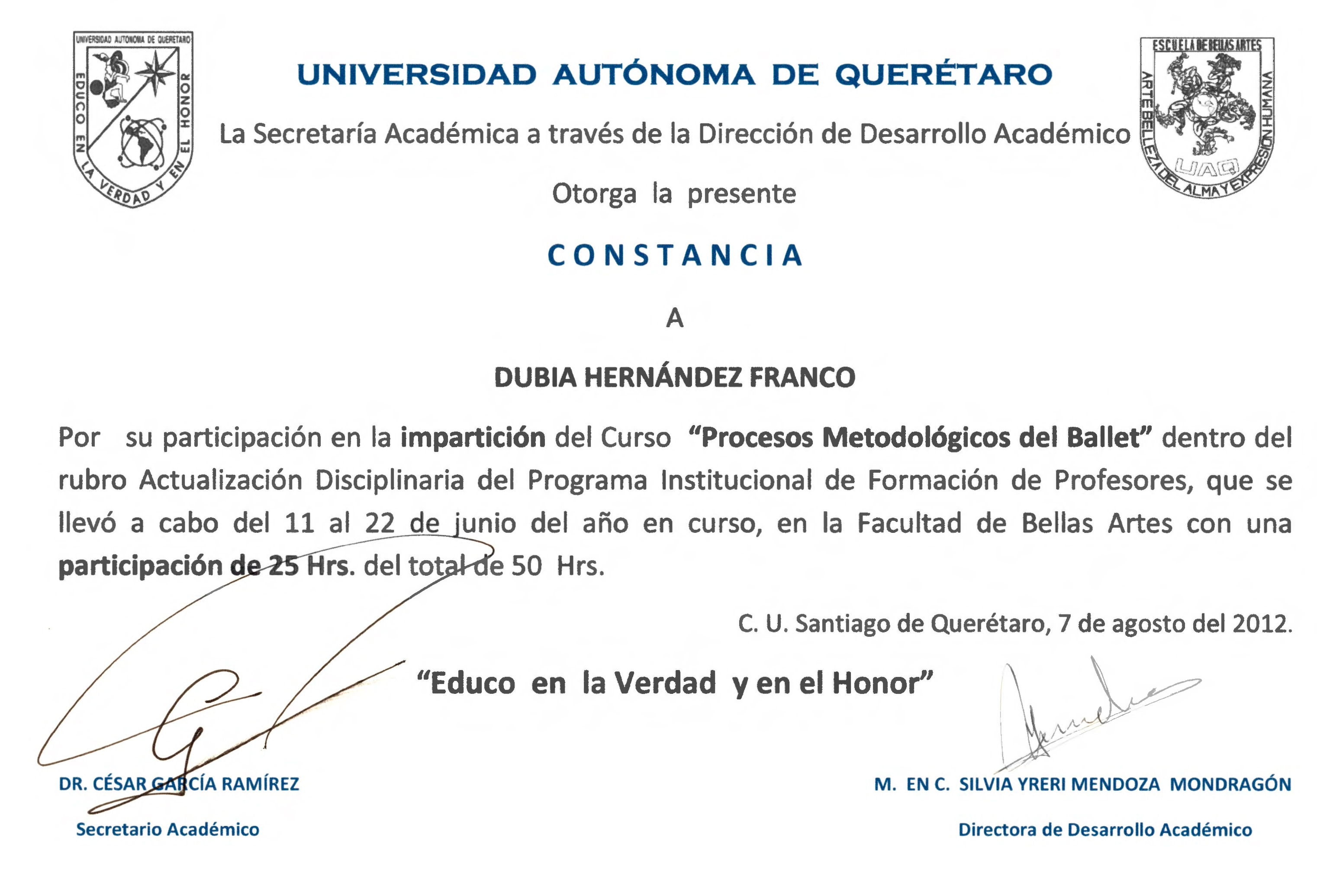 Dubia Hernández, “Constancia Curso Procesos Metodológicos del Ballet 2012,” ReDCA-Ballet, consulta 9 de marzo de 2026, http://redca.uaq.mx/ballet/items/show/858.