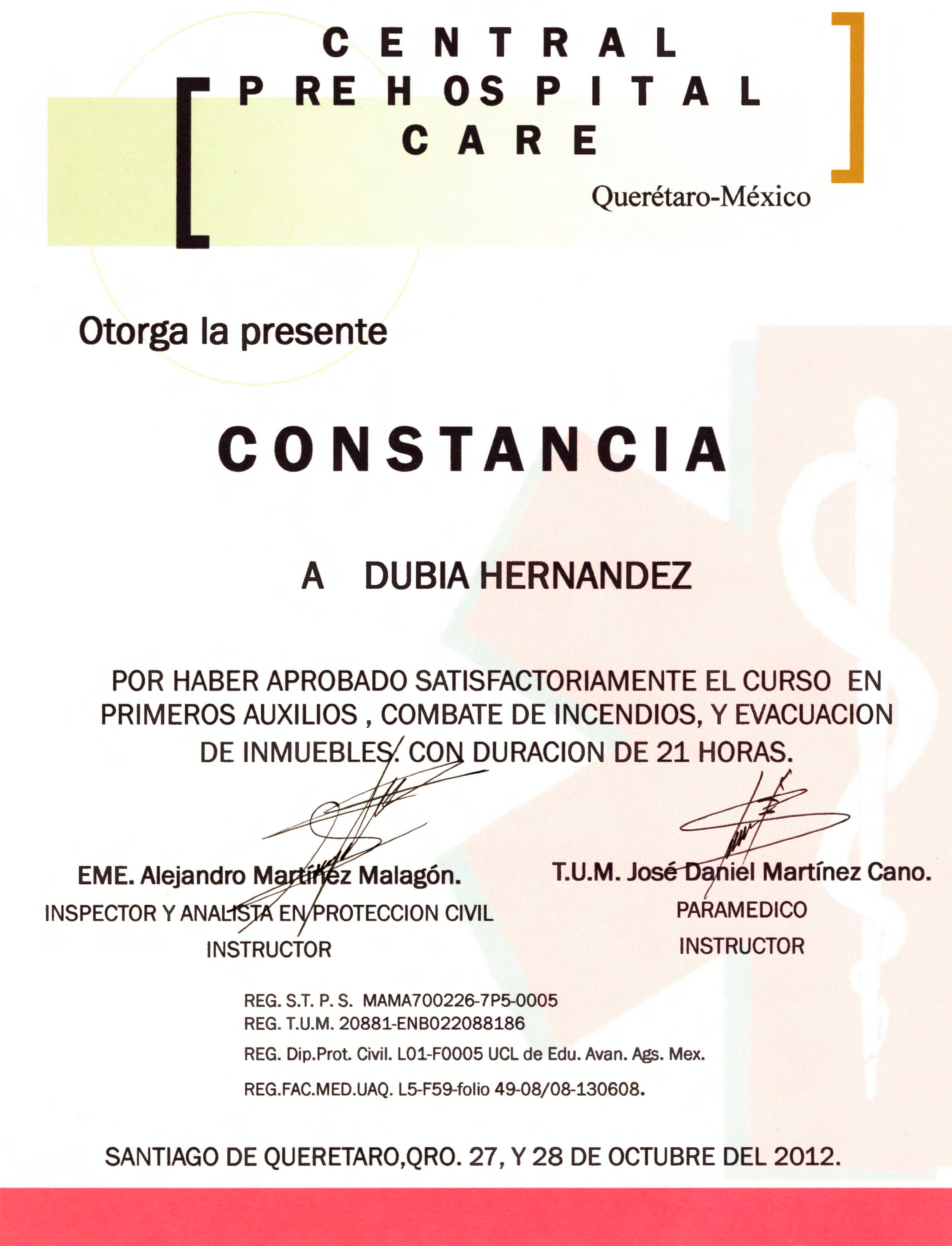 Dubia Hernández, “Constancia Curso en Primeros Auxilios, combate de incendios y evacuación de inmuebles,” ReDCA-Ballet, consulta 9 de marzo de 2026, http://redca.uaq.mx/ballet/items/show/859.