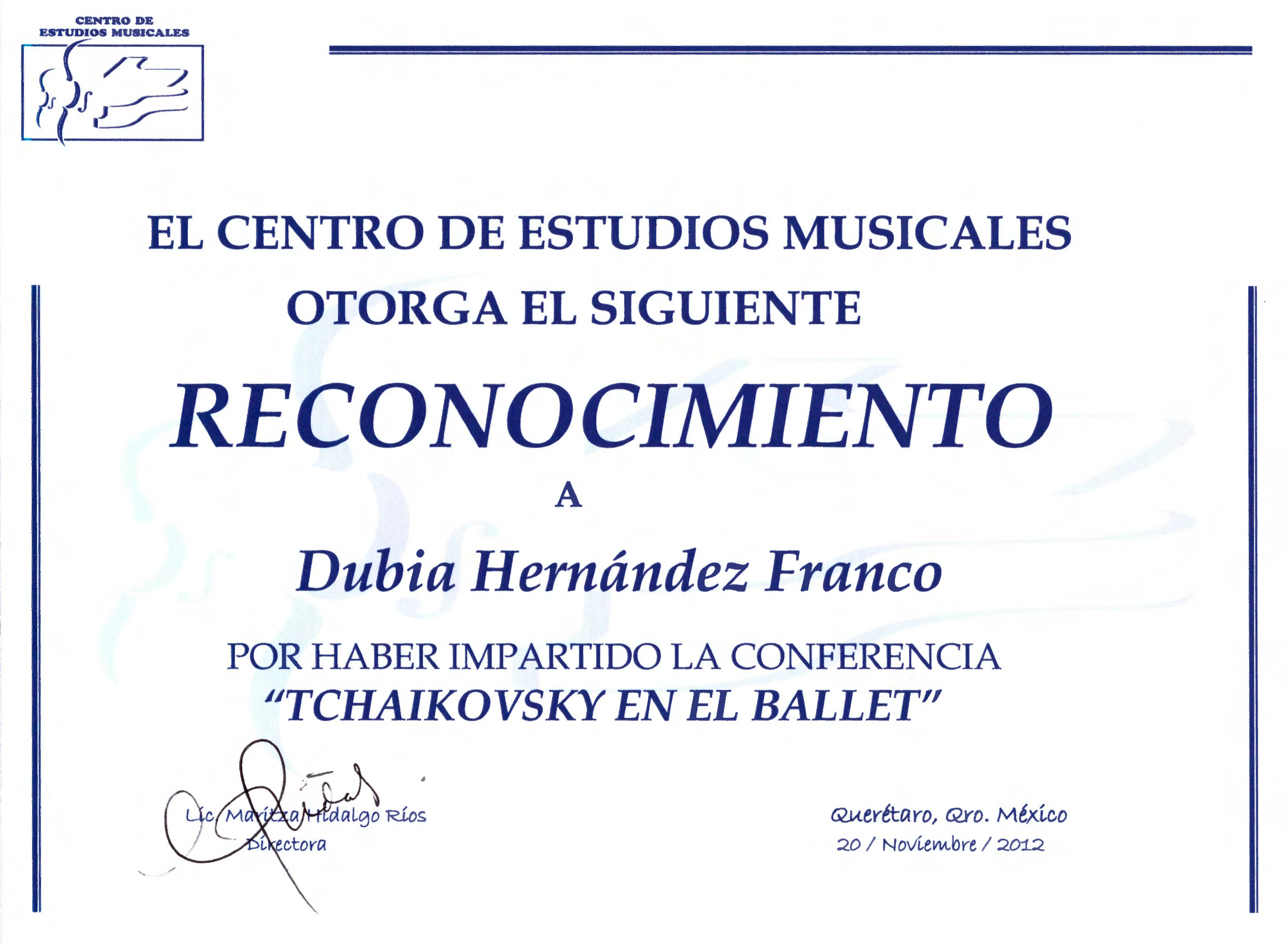 Reconocimiento por haber impartido la conferencia "Tchaikovsky en el ballet" en el Centro de Estudios Musicales