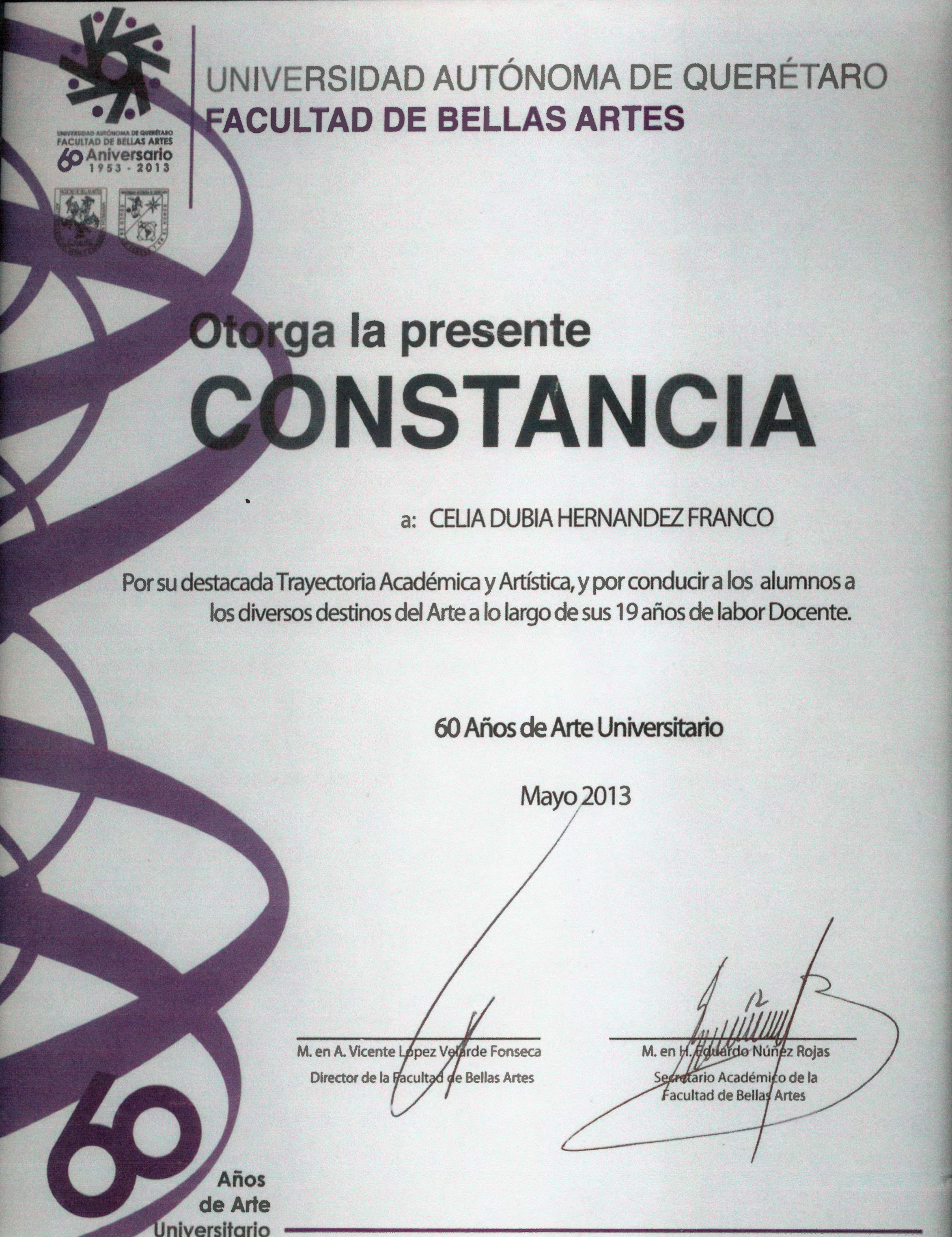 Constancia por trayectoria académica y artística por conducir a los alumnos a los diversos destinos del Arte a lo largo de sus 19 años de labor Docente