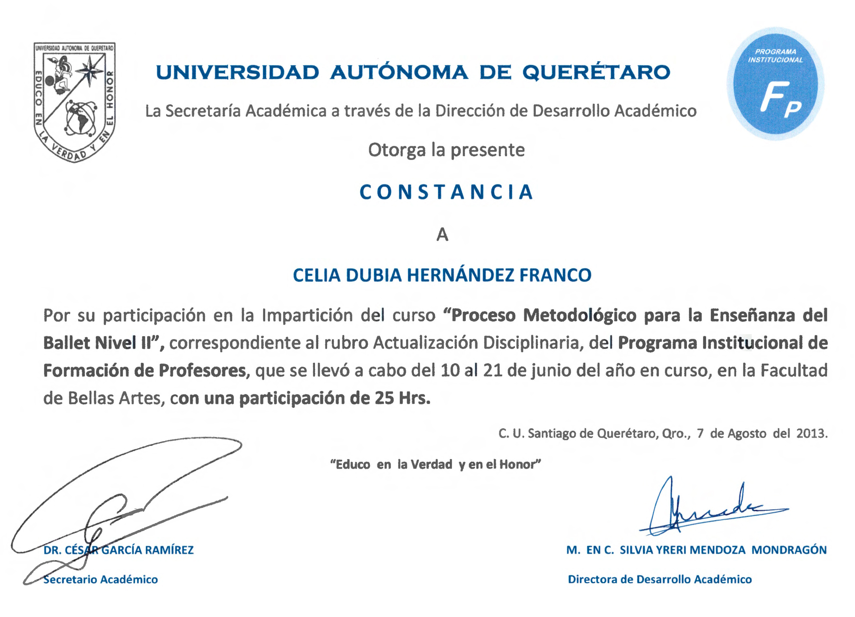 Dubia Hernández, “Constancia Proceso Metodológico para la Enseñanza del Ballet Nivel II,” ReDCA-Ballet, consulta 9 de marzo de 2026, http://redca.uaq.mx/ballet/items/show/873.