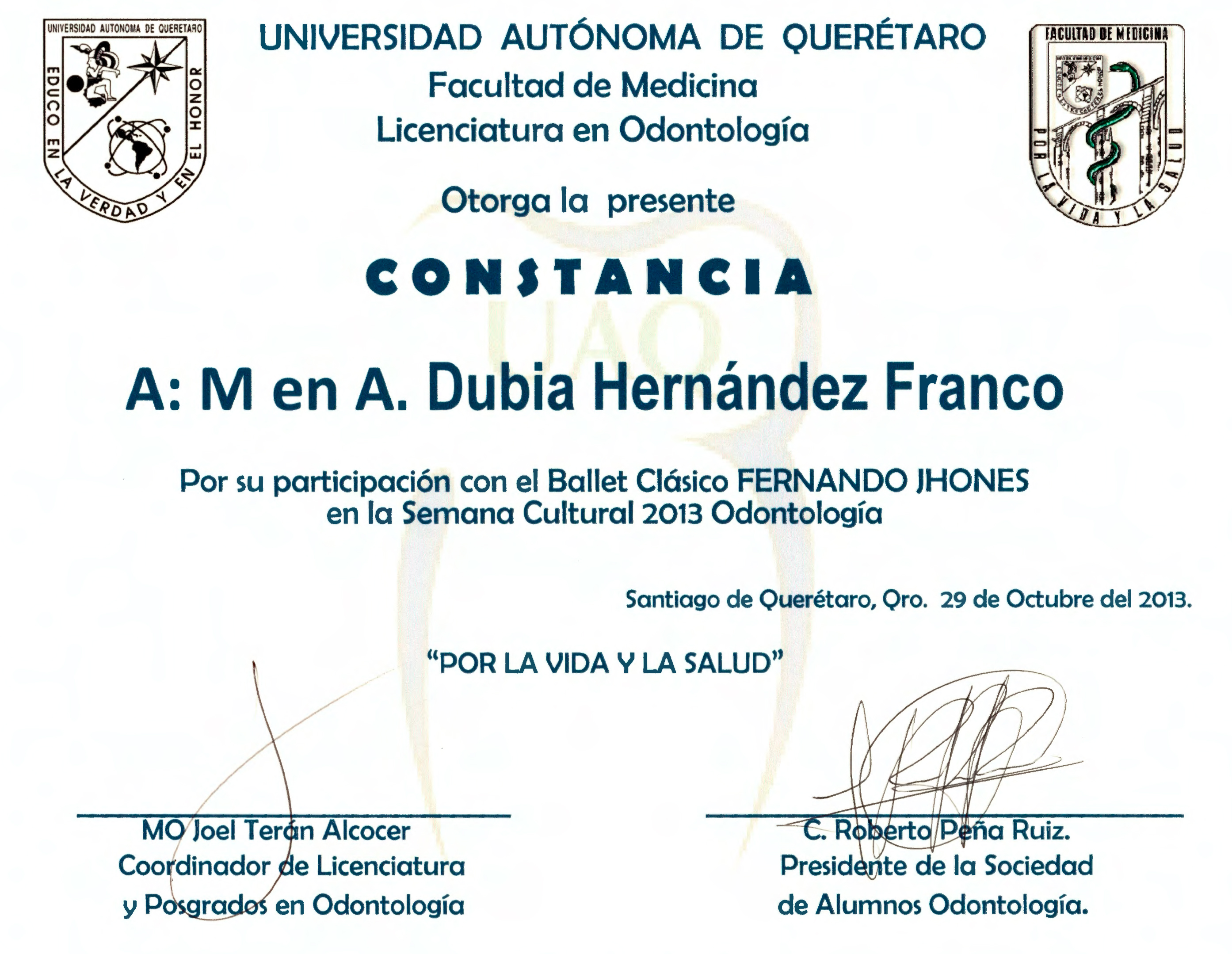 Dubia Hernández, “Constancia Semana Cultural 2013 Odontología,” ReDCA-Ballet, consulta 9 de marzo de 2026, http://redca.uaq.mx/ballet/items/show/877.