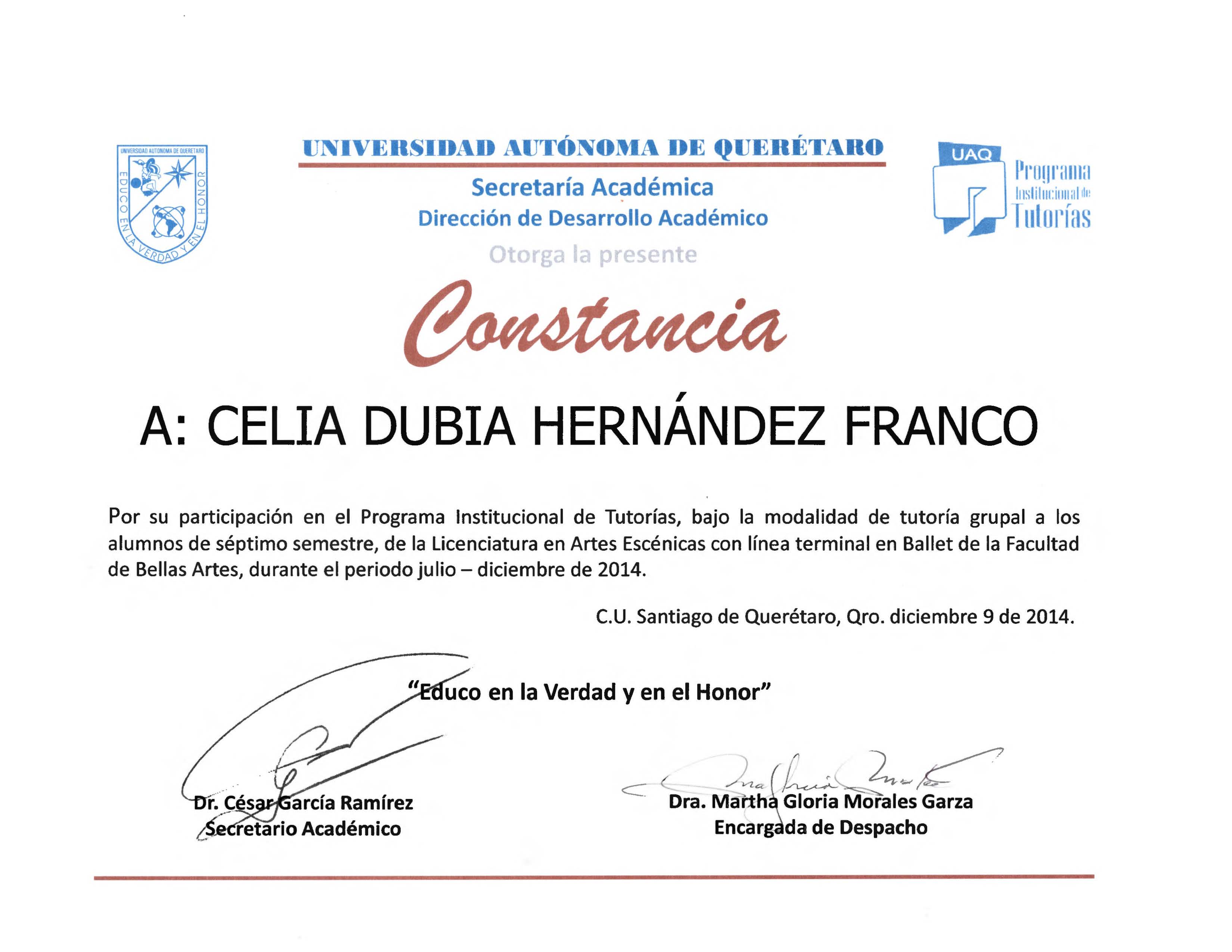 Celia Dubia Hernández Franco, “Constancia programa institucional de tutorías 7° semestre,” ReDCA-Ballet, consulta 9 de marzo de 2026, http://redca.uaq.mx/ballet/items/show/896.