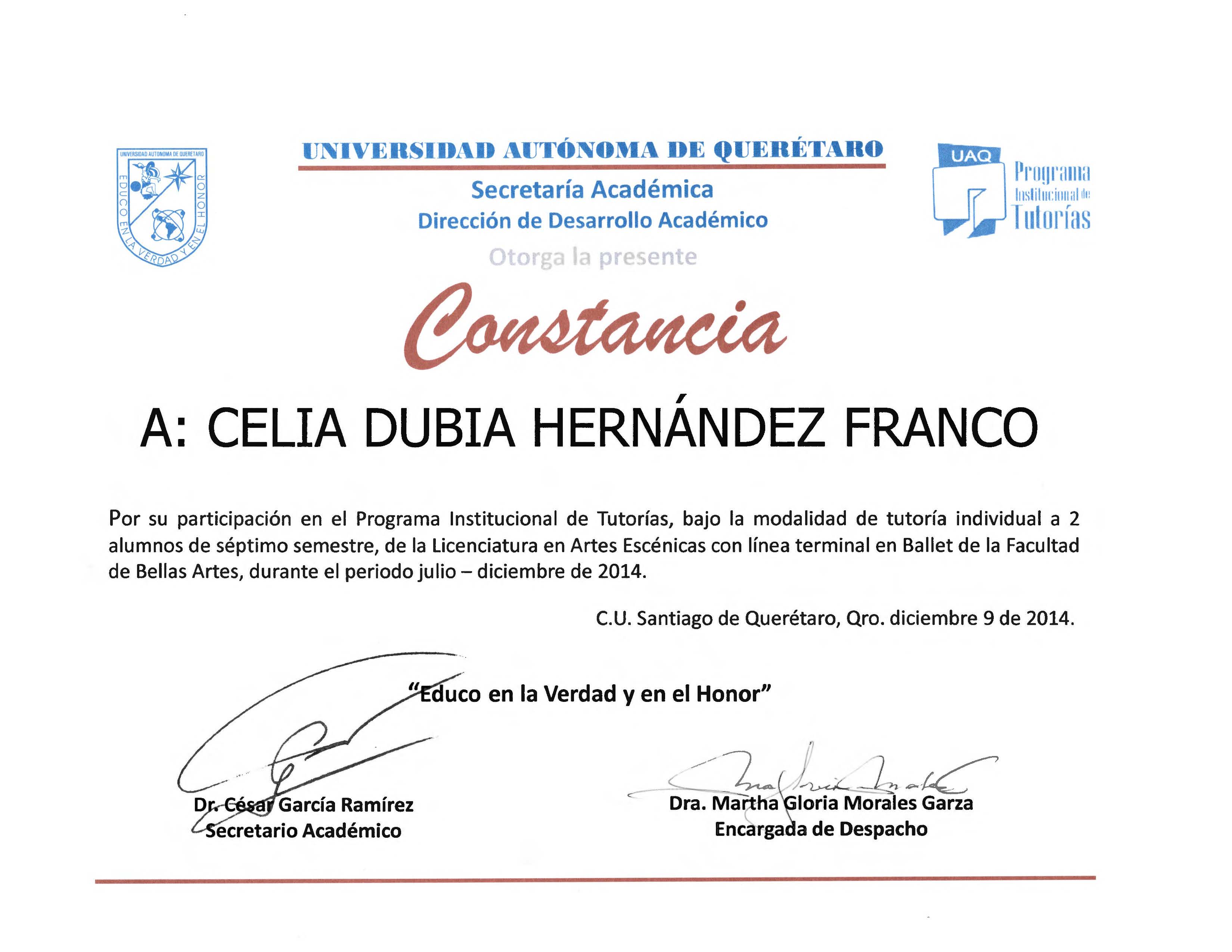 Celia Dubia Hernández Franco, “Constancia programa institucional de tutorías individual 7° semestre,” ReDCA-Ballet, consulta 9 de marzo de 2026, http://redca.uaq.mx/ballet/items/show/898.
