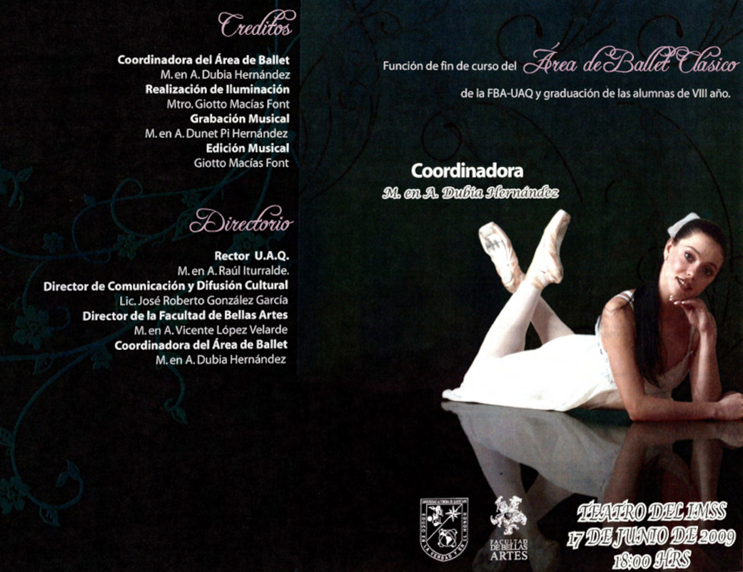 Ballet Clásico de Querétaro, “Función fin de curso del Área de Ballet Clásico 2009,” ReDCA-Ballet, consulta 9 de marzo de 2026, http://redca.uaq.mx/ballet/items/show/904.