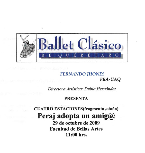 Ballet Clásico de Querétaro, “Programa Cuatro estaciones Peraj adopta un amig@ 2009,” ReDCA-Ballet, consulta 9 de marzo de 2026, http://redca.uaq.mx/ballet/items/show/906.