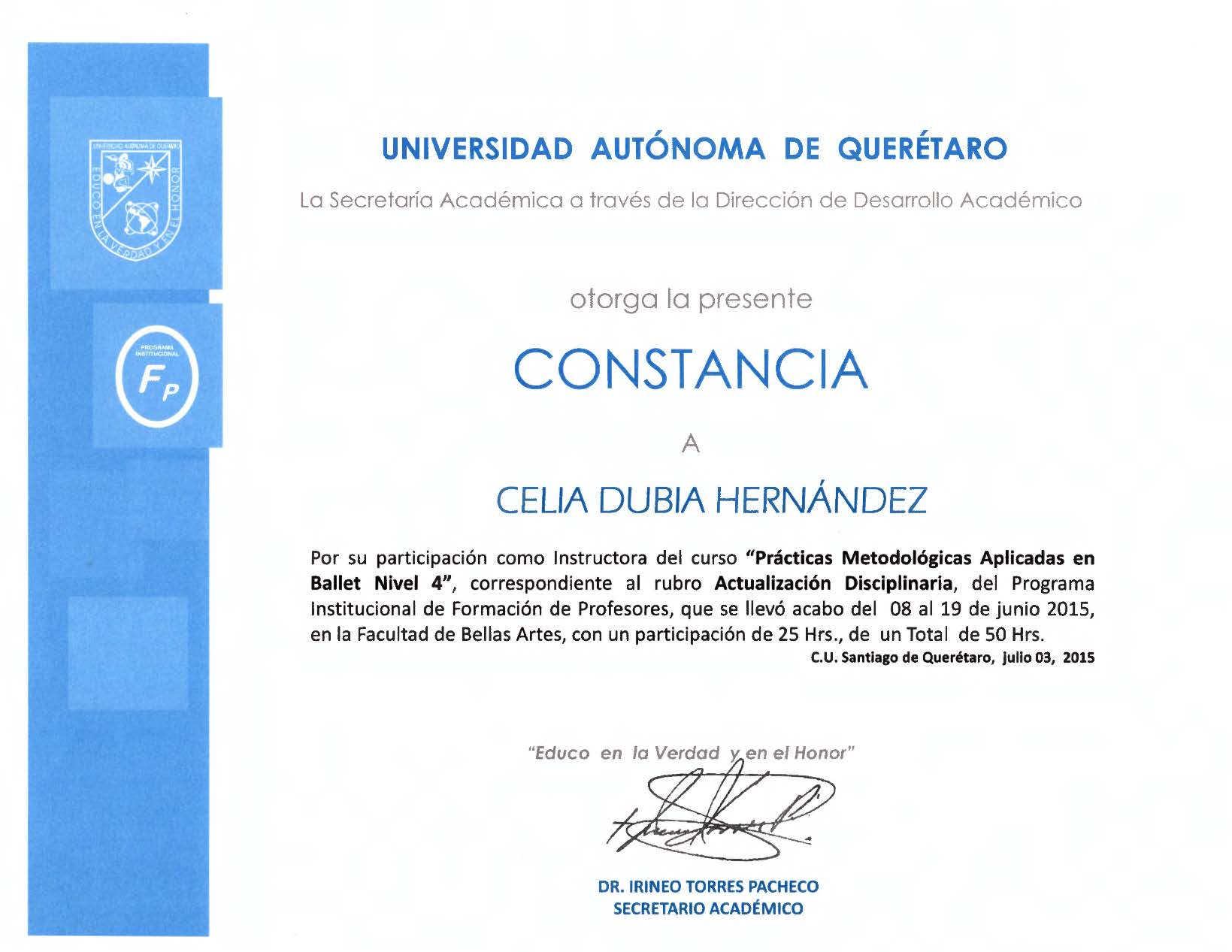 Por su participación como Instructora del curso "Prácticas Metodológicas Aplicadas en Ballet Nivel 4", correspondiente al rubro Actualización Disciplinaria, del Programa Institucional de Formación de Profesores.