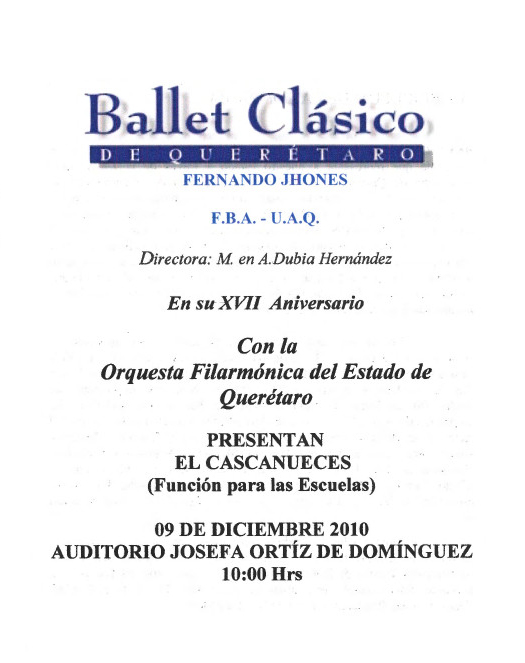 Ballet Clásico de Querétaro, “Programa XVII Aniversario OFEQ,” ReDCA-Ballet, consulta 9 de marzo de 2026, http://redca.uaq.mx/ballet/items/show/911.