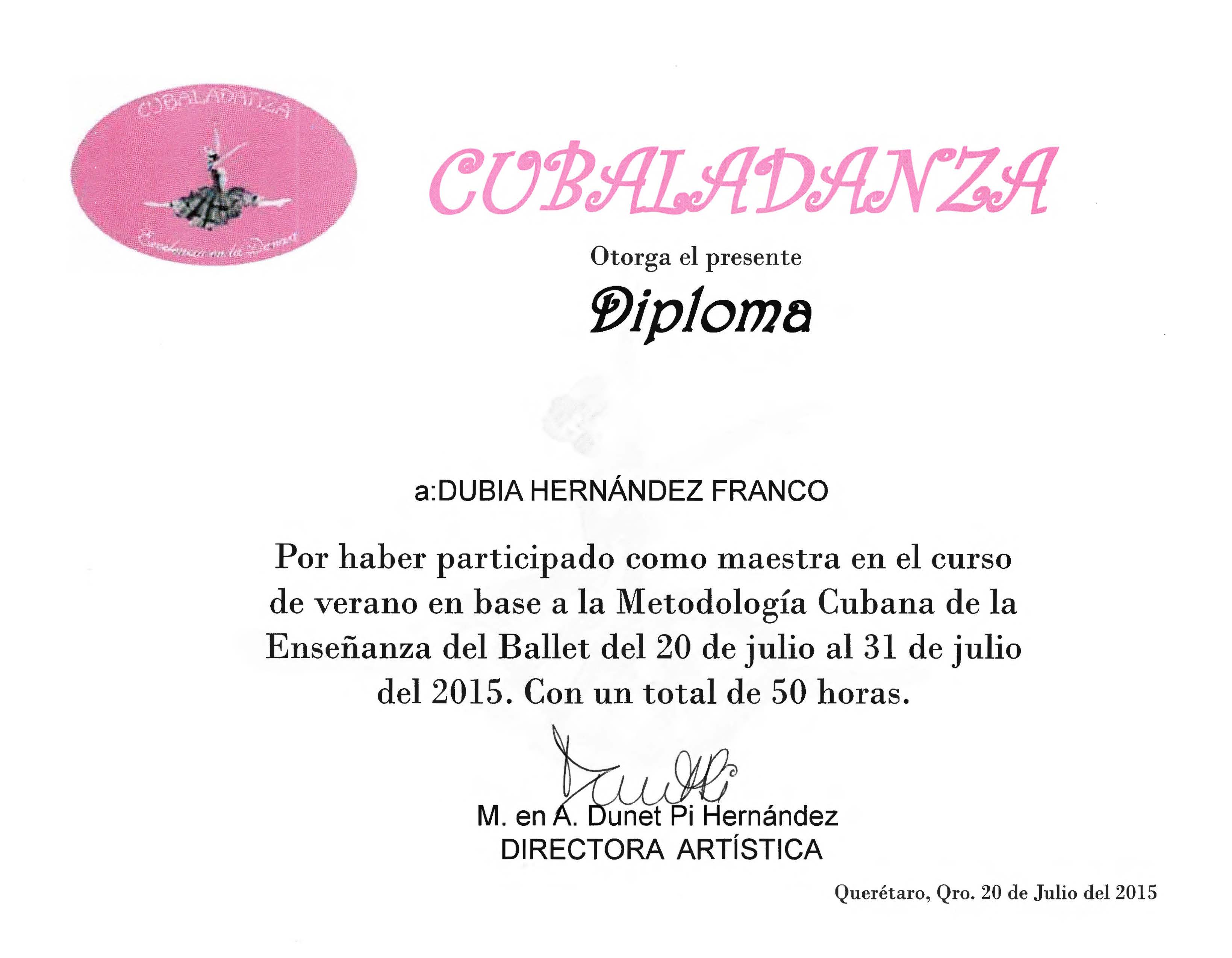 Por haber participado como maestra en el curso de verano en base a la Metodología Cubana de la Enseñanza del Ballet.