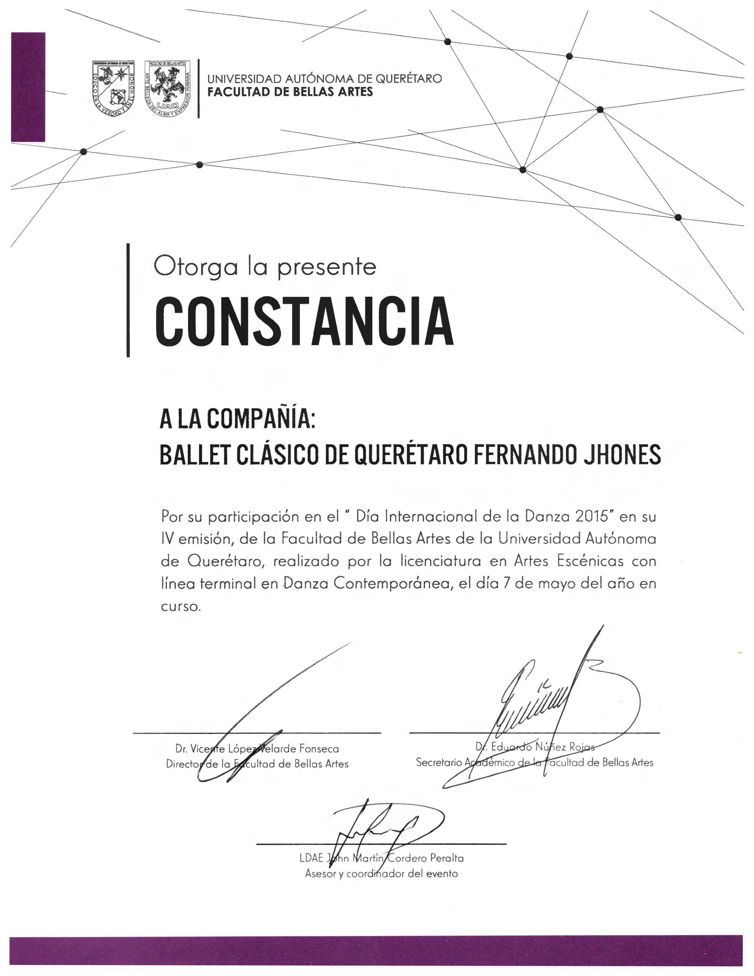 Por su participación en el" Día Internacional de la Danza 2015" en su IV emisión, de la Facultad de Bellas Artes de la Universidad Autónoma de Querétaro.