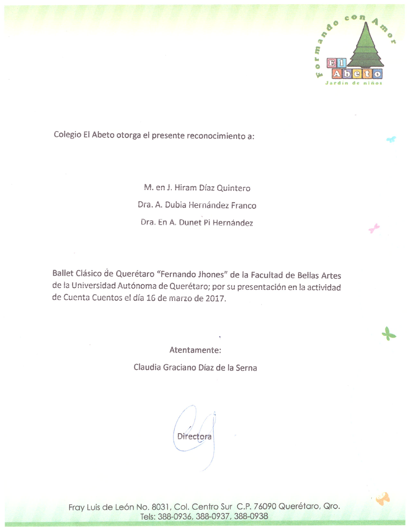 Reconocimiento al Ballet Clásico de Querétaro “Fernando Jhones” por su participación en el evento Cuenta Cuentos