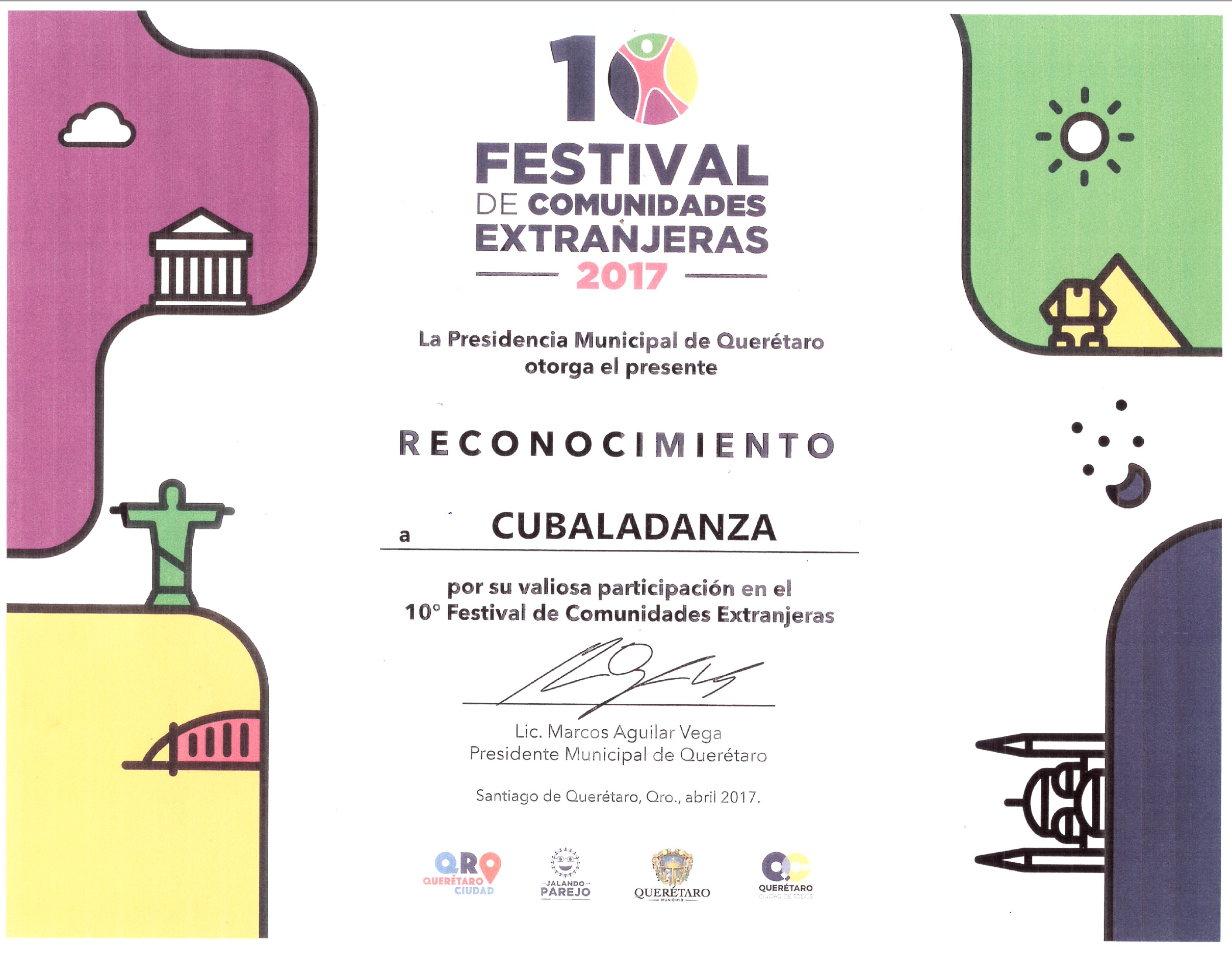 Presidencia Municipal de Queretaro, “Reconocimiento participación 10 Festival de Comunidades Extranjeras,” ReDCA-Ballet, consulta 9 de marzo de 2026, http://redca.uaq.mx/ballet/items/show/936.