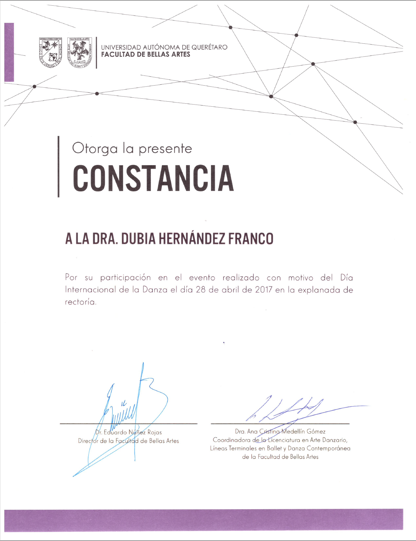 FBA UAQ, “Constancia evento Día Internacional de la Danza,” ReDCA-Ballet, consulta 9 de marzo de 2026, http://redca.uaq.mx/ballet/items/show/938.