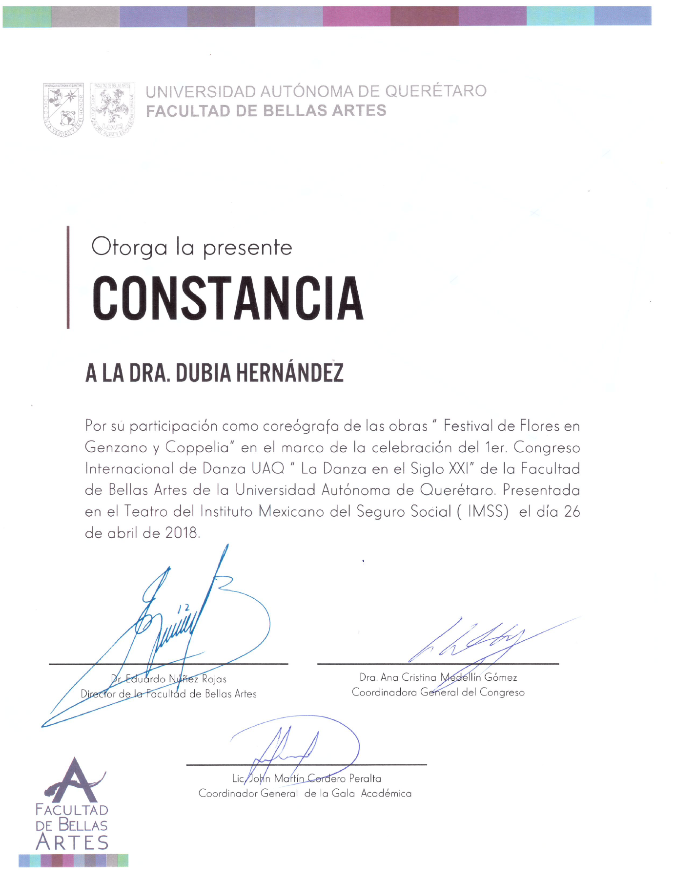 Dubia Hernandez, “Constancia coreografa Festival de Flores en Genzeno y Coppelia,” ReDCA-Ballet, consulta 9 de marzo de 2026, http://redca.uaq.mx/ballet/items/show/939.
