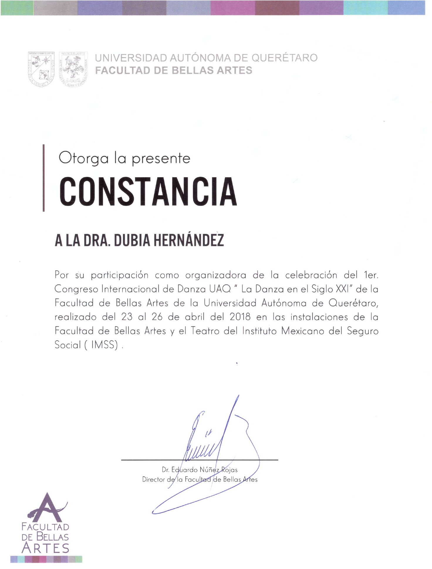 Dubia Hernandez, “Constancia orgranizadora 1er CIDUAQ,” ReDCA-Ballet, consulta 9 de marzo de 2026, http://redca.uaq.mx/ballet/items/show/941.