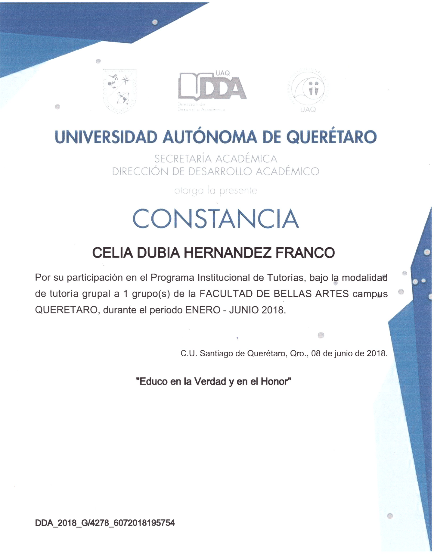 Constancia otorgada a Dubia Hernandez por su participacion en el Programa Institucional de Tutorias en modalidad tutoria grupal a 1 grupo de la Facultad de Bellas Artes durante el periodo Enero Junio 2018