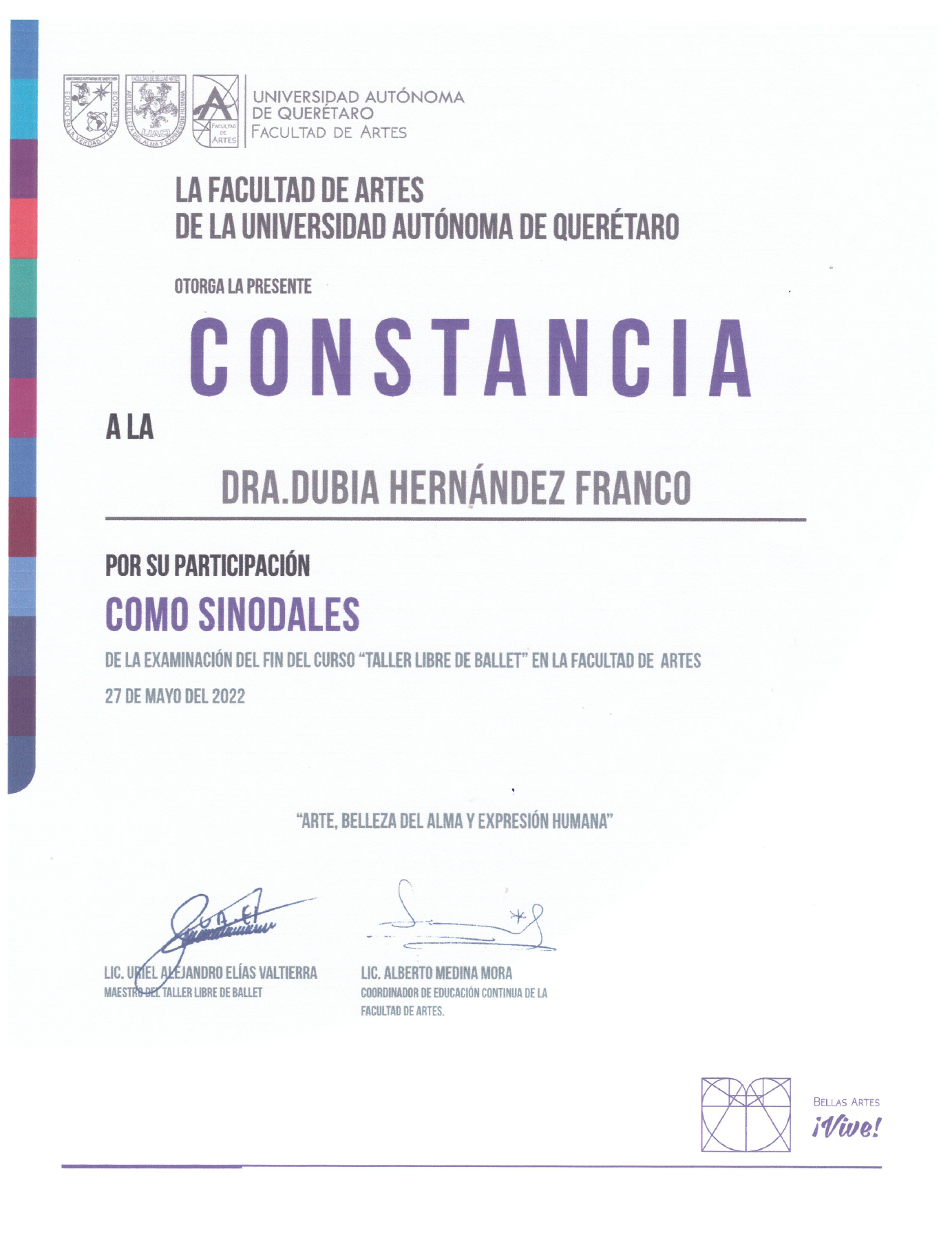 Dubia Hernandez, “Constancia Taller libre de ballet,” ReDCA-Ballet, consulta 9 de marzo de 2026, http://redca.uaq.mx/ballet/items/show/954.