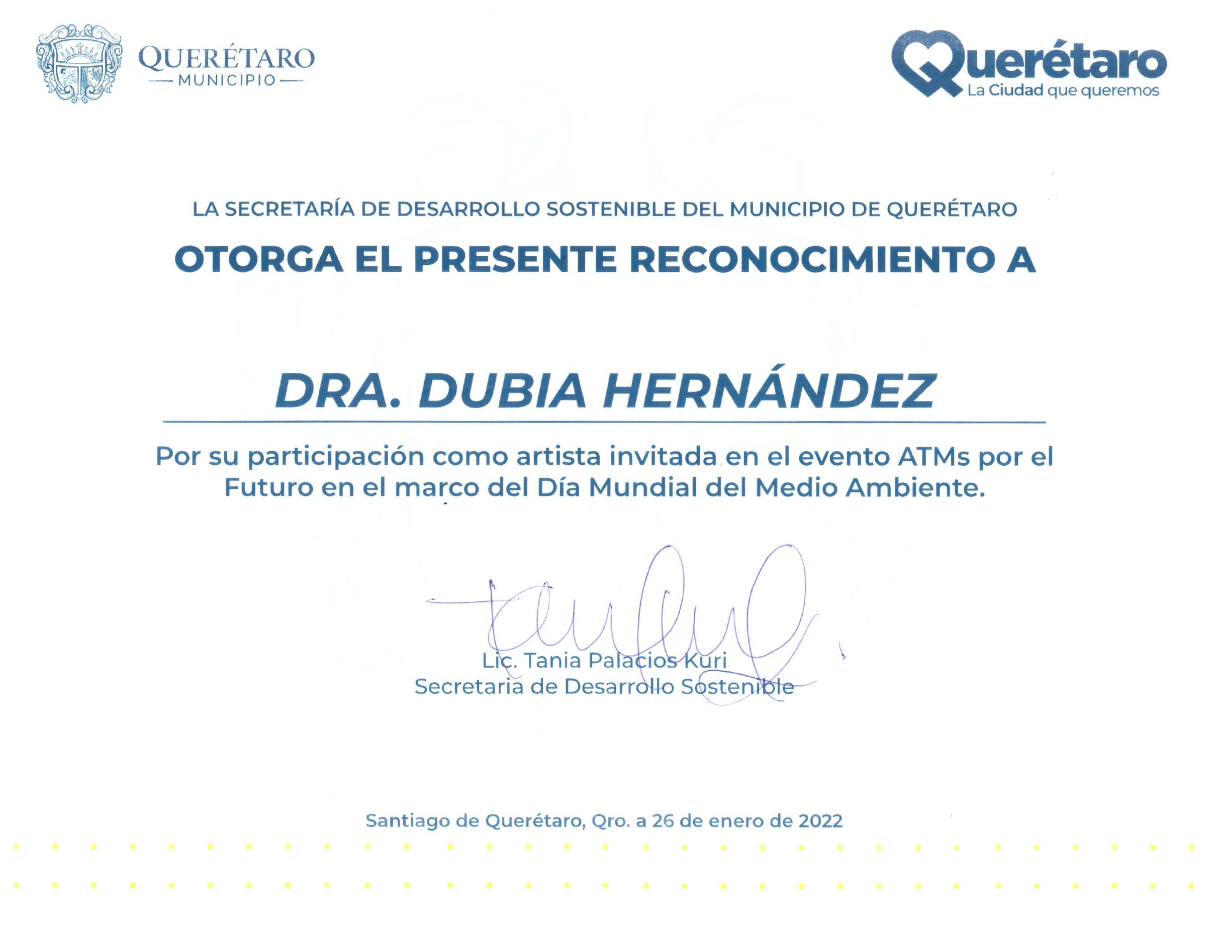 Reconocimiento otorgado a Dubia Hernandez por su participacion en el evento ATMs por el Futuro en el marco del Dia Mundial del Medio Ambiente