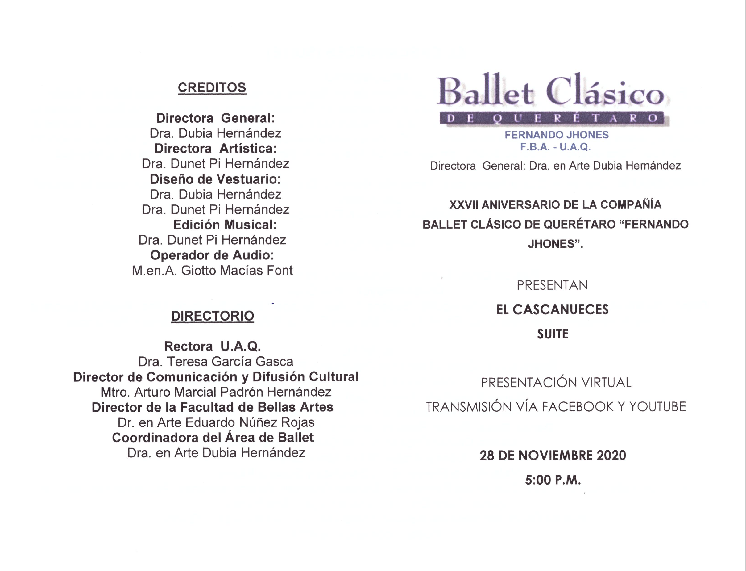 Programa de la presentacion del Cascanueces presentado por Ballet Clasico de Queretaro Fernando Jhones de la Facultad de Bellas Artes - Universidad Autonoma de Queretaro