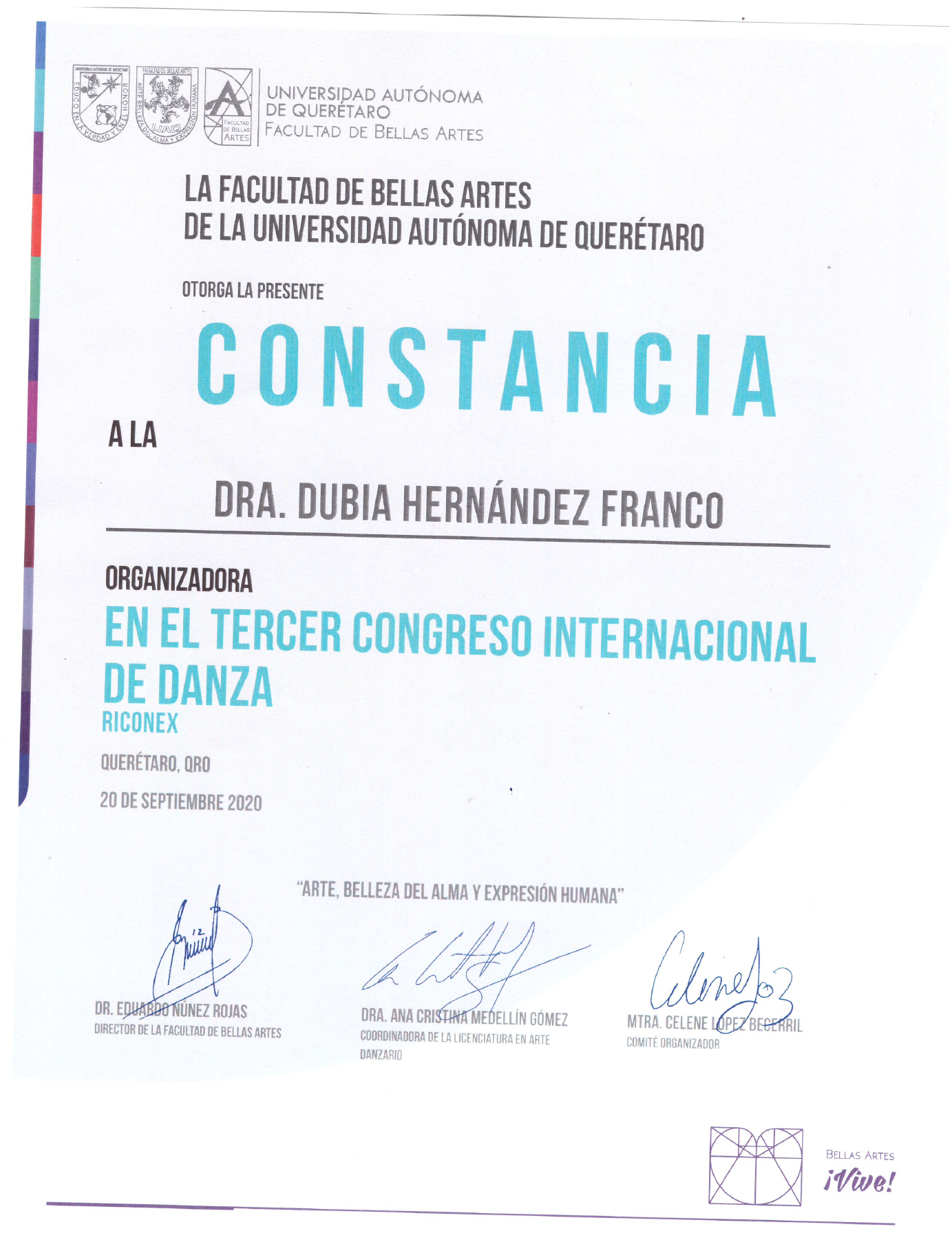 Dubia Hernandez, “Constancia Tercer Congreso Internacional de Danza,” ReDCA-Ballet, consulta 9 de marzo de 2026, http://redca.uaq.mx/ballet/items/show/976.