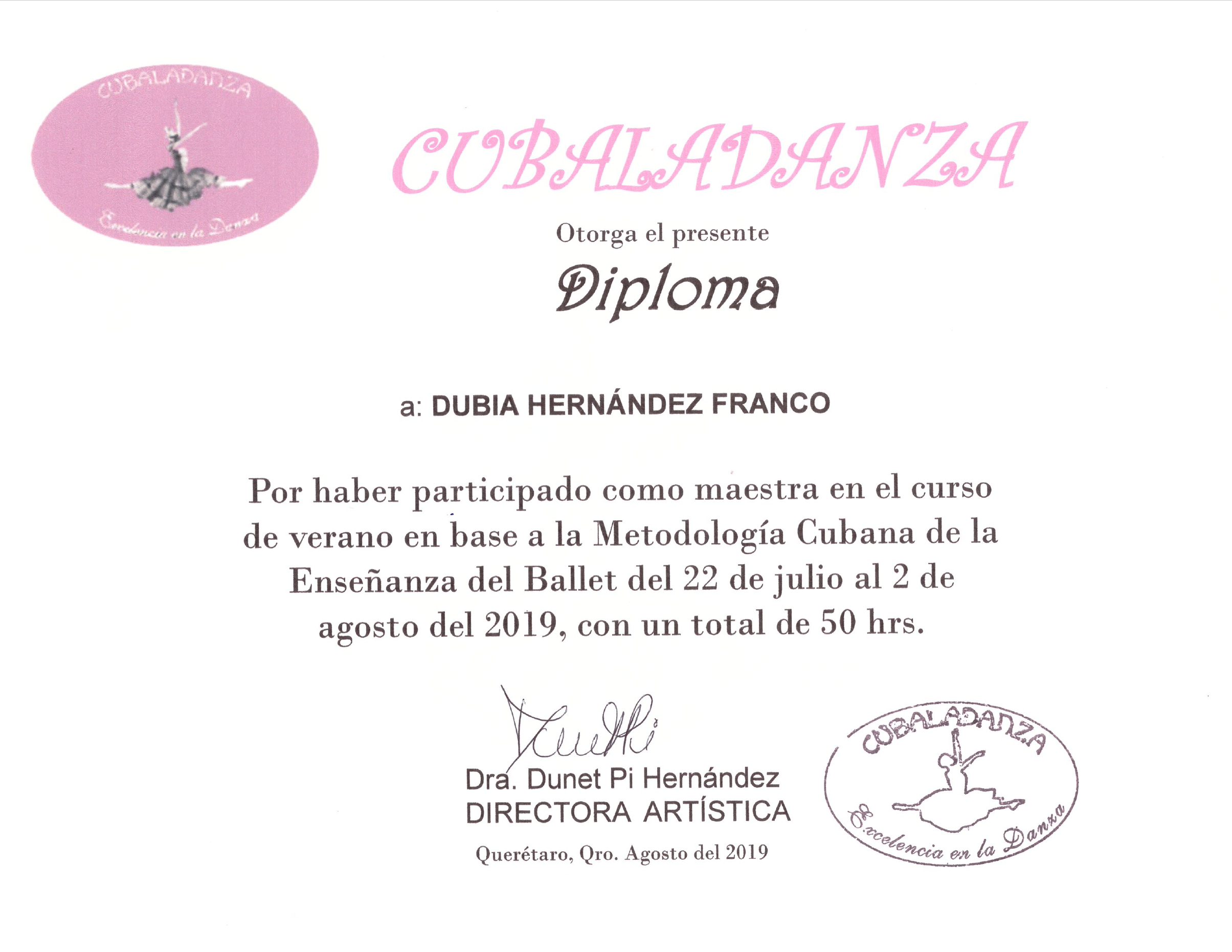 Diploma entregado a Dubia Hernandez por su participicion en el curso de verano Metodologia Cubana de la Enseñanza del Ballet
